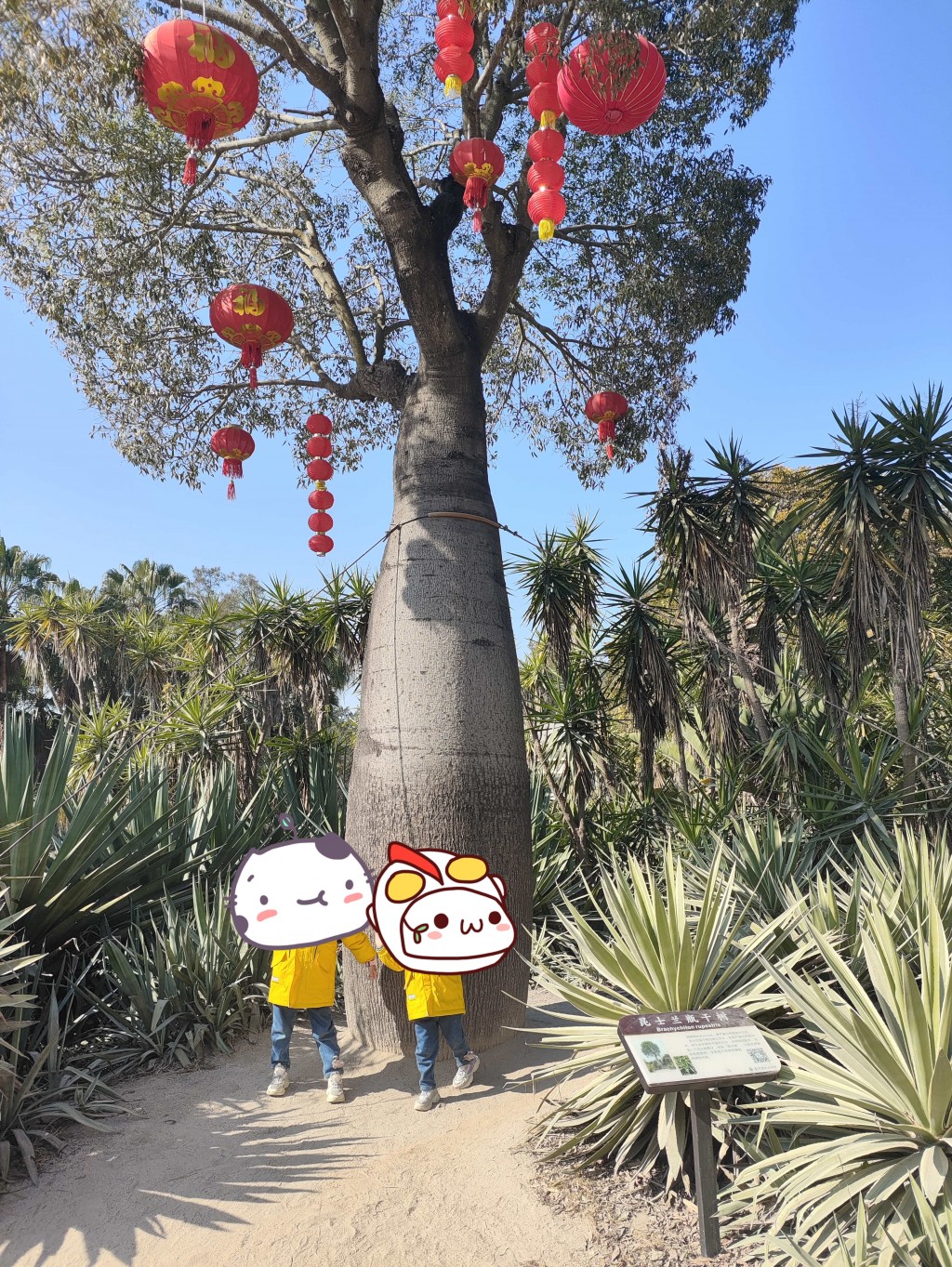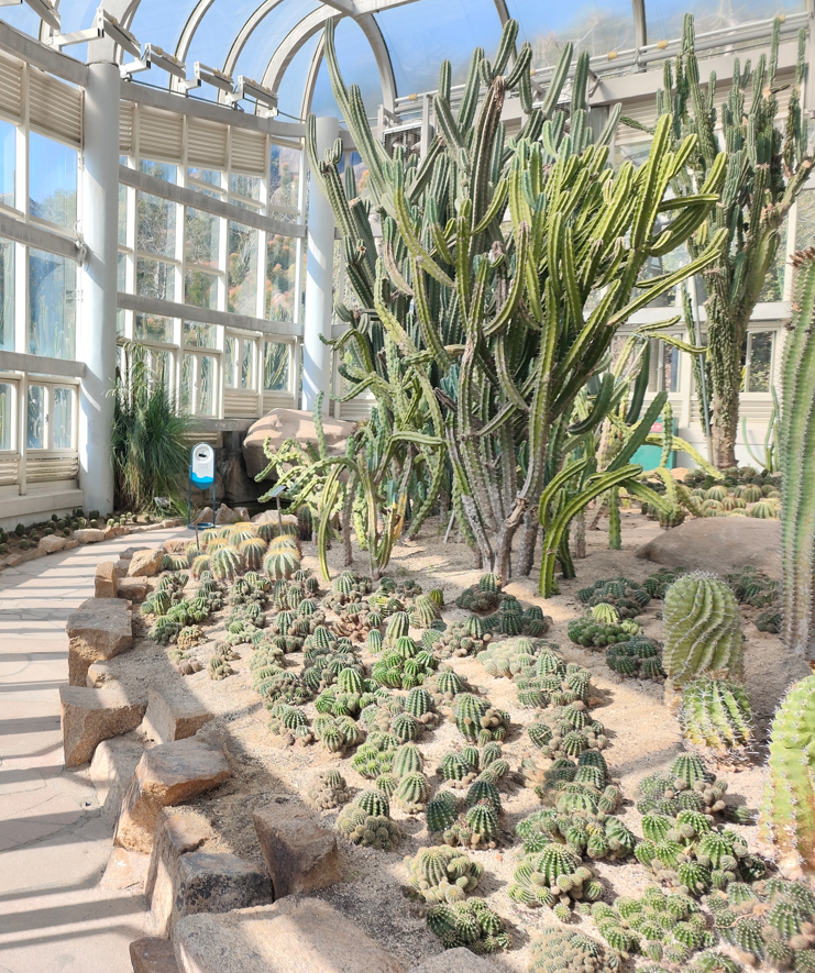 从湿润的雨林走进多肉植物区,像瞬间穿越到了戈壁荒漠。这里是巨型多肉的王国:高耸的巨人柱直戳天空,最粗的地方要两人合抱;圆滚滚的仙人球挤挤挨挨,有的顶着嫩黄色的花,有的裹着毛茸茸的刺;龙舌兰的叶片锋利如剑,边缘泛着银边,在烈日下闪着倔强的光。