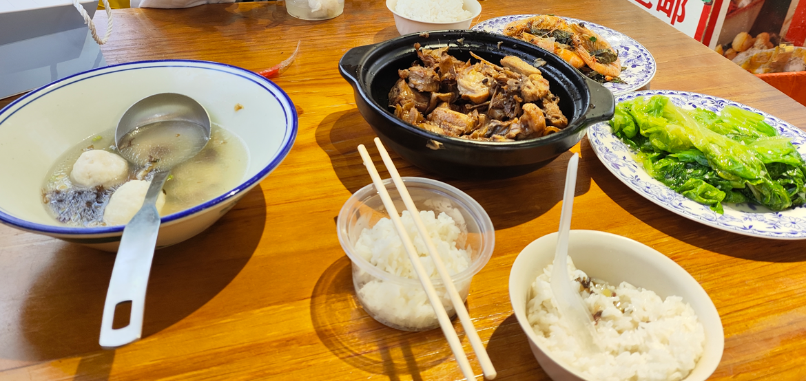 中午的时候我找了一家龙江猪脚饭店。这里很多龙江猪脚饭店,而且每家人数都不少。之前虽然经常见隆江猪脚饭,但是我从来没有去吃过,这次感觉味道还不错,有搭配的青菜也有免费的汤,其实营养还是挺全面的。
