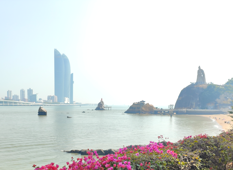 午后的时光,适合奔赴山海之约。沿着环岛路缓缓漫步,一侧是蔚蓝的大海,沙滩细腻柔软,有人在岸边嬉戏踏浪,有人躺着晒太阳,享受片刻的慵懒;另一侧是葱郁的植被,凤凰木开得热烈,火红的花瓣落在青石板上,成了天然的点缀。走到日光岩脚下,没有选择登顶俯瞰,而是沿着山脚的步道前行,听林间鸟鸣,看光影透过树叶洒下斑驳的碎光,感受山海相依的静谧与美好。