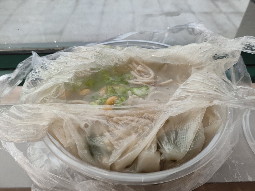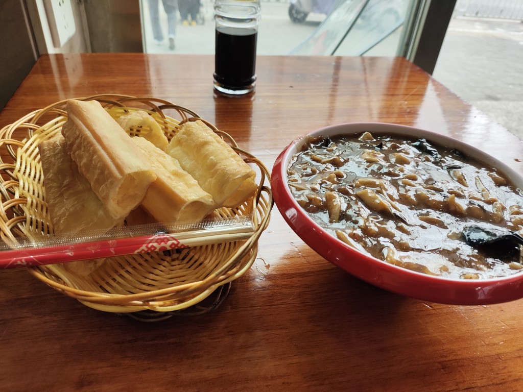 我到达汝州站的时间是12点多,早就听闻河南的胡辣汤比较出名,所以我选择了医院旁边一家比较大的胡辣汤店。但等我打车到了店里的时候被告知中午不营业,我只能去了附近的一家快餐店。这家店里有盒饭炒菜,也有胡辣汤,油条包子等,应该是早晨剩下的。于是我就要了一份胡辣汤和油条,但是不知道是这家店不专业的原因,还是我喝不惯的原因,我觉得不怎么好喝。