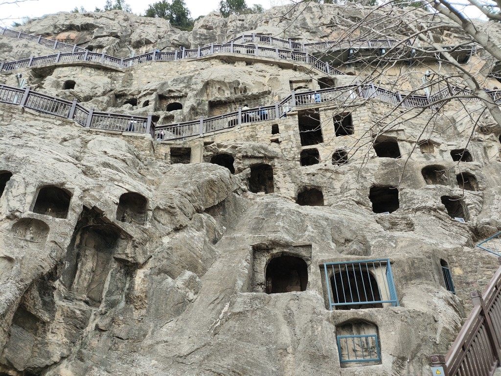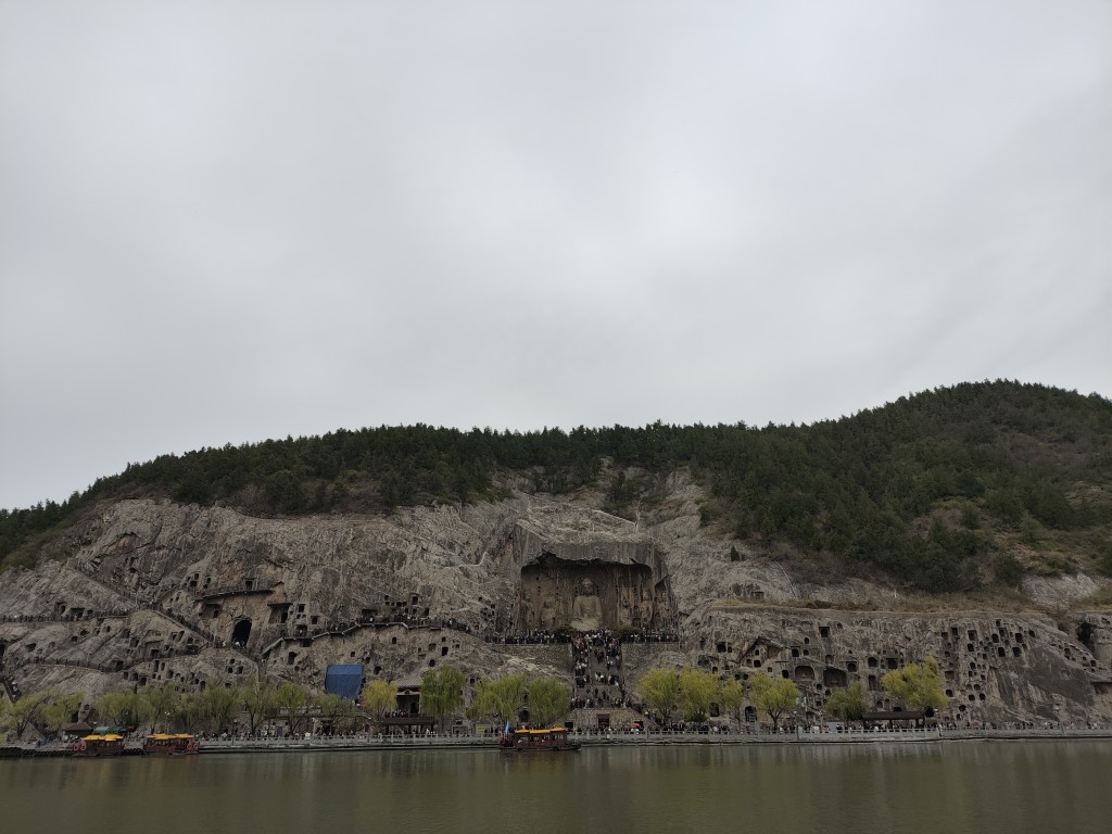 过了伊河桥,远远就望见西山崖壁上密密麻麻的佛龛,像被时光封存的星河。拾级而上,最先撞见的是宾阳中洞,洞口的北魏风格浮雕线条利落,飞天的裙摆似要乘风而起,虽历经风雨有些斑驳,却仍能想见当年工匠落笔时的虔诚。沿着石阶往前走,伊河在脚下缓缓淌着,对岸的香山寺黛瓦红墙,和崖壁上的石窟遥遥相望,倒像一场跨越千年的对视。