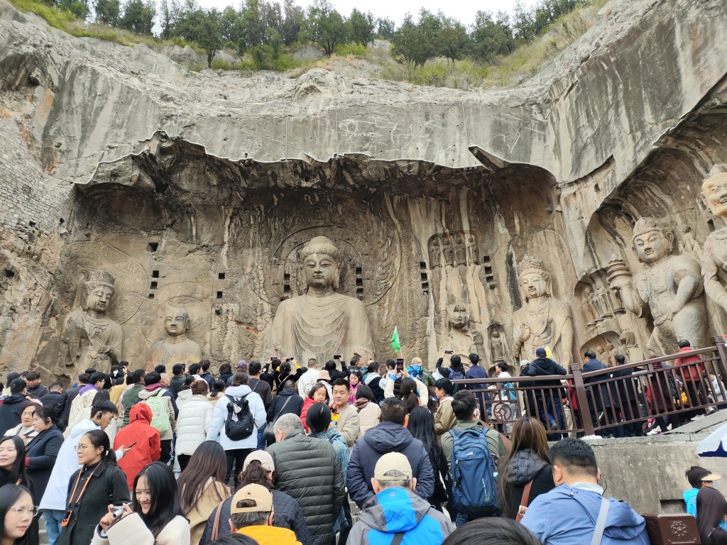 最震撼的还是奉先寺的卢舍那大佛。站在佛脚下的那一刻,所有语言都显得苍白——大佛高十七米有余,面容温润含笑,眉骨弯弯似藏着慈悲,耳垂垂落至肩,衣袂的褶皱流畅如水波。阳光斜斜打在佛的脸颊上,光影里,仿佛能听见千年前凿石的叮当声,看见工匠们顶着烈日、借着油灯,一锤一凿将信仰刻进山石。听旁边的导游说,这尊佛是以武则天为原型塑造的,难怪眉眼间既有佛的庄严,又藏着人的温柔。我在佛前站了许久,风穿过佛龛的缝隙,带来伊河的水汽,心里的浮躁竟一点点沉了下去,只剩一种被岁月包裹的安宁。