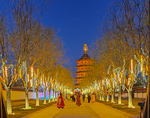 回去查了下洛邑古城以唐、宋、元、明、清、民国建筑风格为基调,融合“文、游、购、食、宿、娱”等业态。夜景尤为惊艳,华灯初上时,灯笼次第亮起,文峰塔光影秀流光溢彩,新潭水面倒映着琼楼灯火,汉服游人穿梭其间,古意与烟火气交融;其夜间经济亮点纷呈,“汉服+”产业链崛起,是全国汉服打卡热门地。