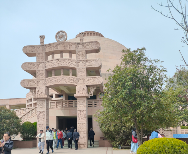 穿过中国古建区,来到印度佛殿苑,这里是中印两国文化交流的结晶。佛殿苑整体风格借鉴印度桑奇大塔与那烂陀寺的建筑元素,以一座圆形窣堵坡式佛塔为中心。塔身高约 18 米,表面雕刻着印度传统佛教图案与犍陀罗风格的浮雕,细节处还原了印度古代佛教建筑的艺术特色。