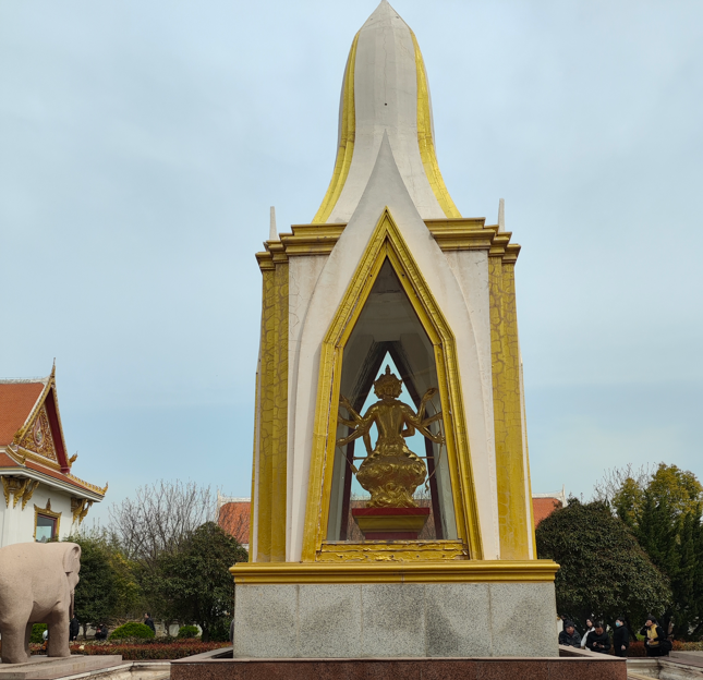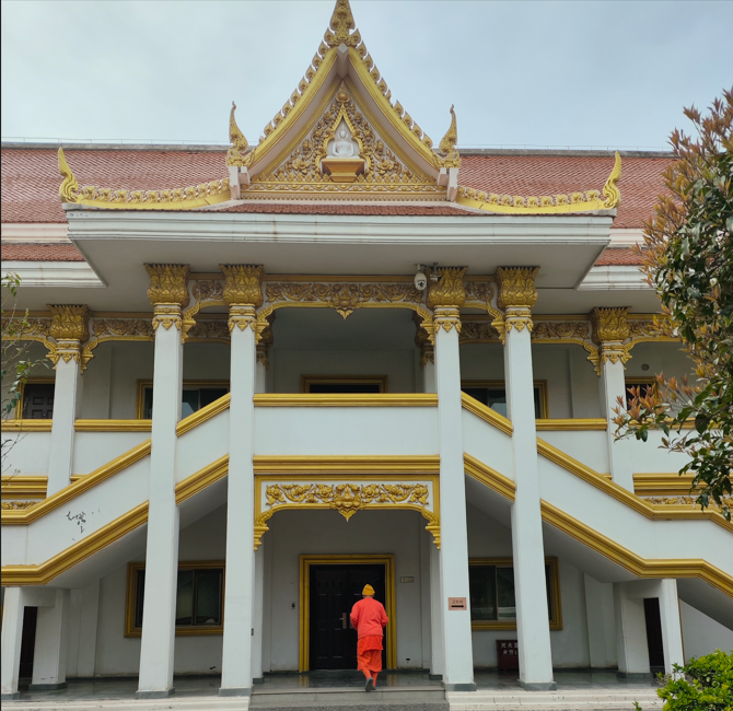 紧邻印度佛殿苑的是泰国佛殿苑,这是目前中国境内规模最大、保存最完整的泰式佛教建筑群之一。佛殿苑的核心是一座泰式尖顶佛殿,殿顶采用多层重檐设计,覆盖着从泰国进口的金色琉璃瓦,在阳光下熠熠生辉。
