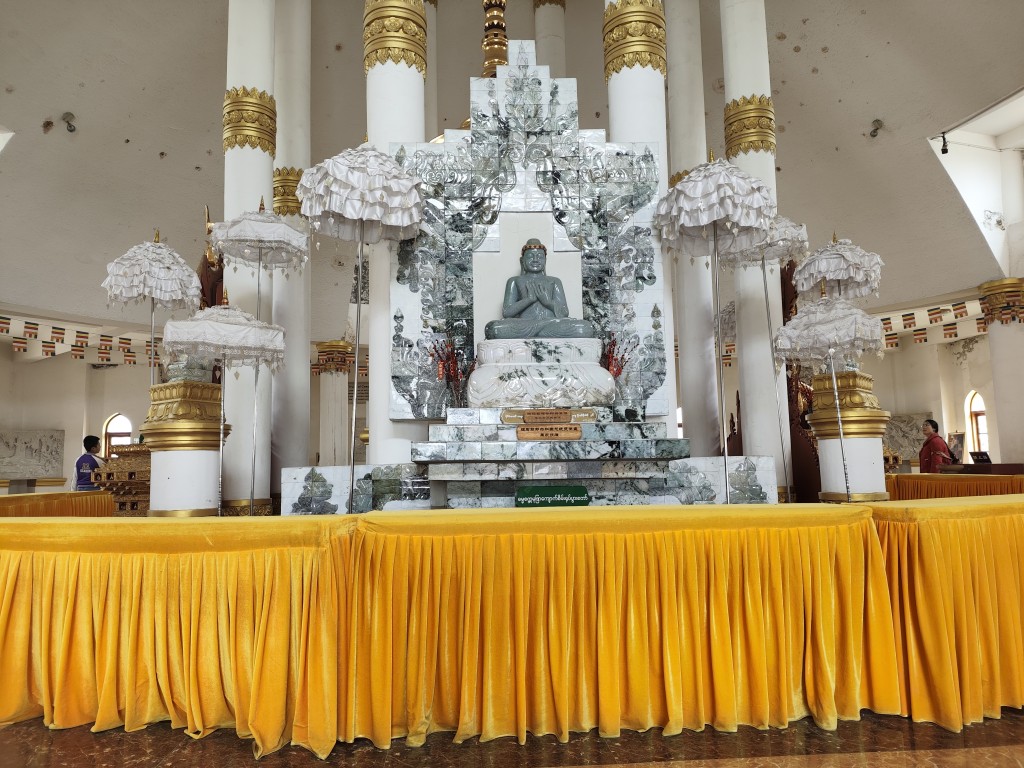 金塔周边环绕着 8 座小型佛塔与 2 座配殿,配殿内供奉着缅甸风格的释迦牟尼佛与观音造像,采用缅甸传统泥塑工艺,色彩浓郁,表情生动。在这里,能感受到缅甸佛教文化的独特魅力和辉煌壮丽。