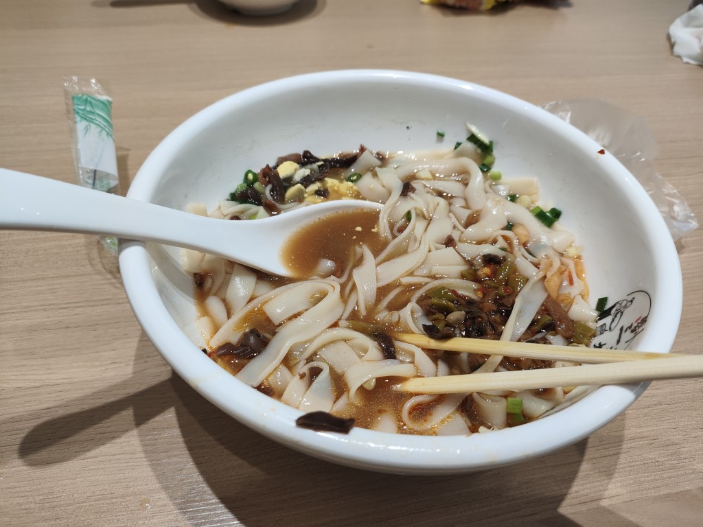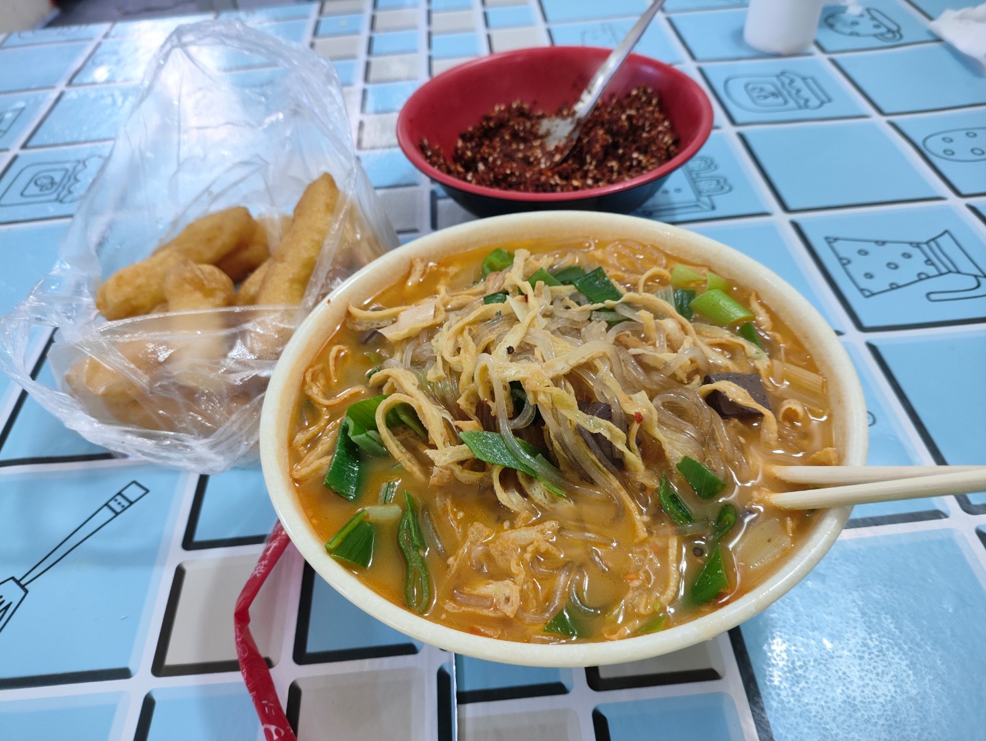 晚上我们去的面馆里正好有这个炒豆丝。于是我点了一份,其实看起来就跟炒粉差不多,只不过,他里面掺了绿豆粉,吃起来跟口感跟炒粉差不多。