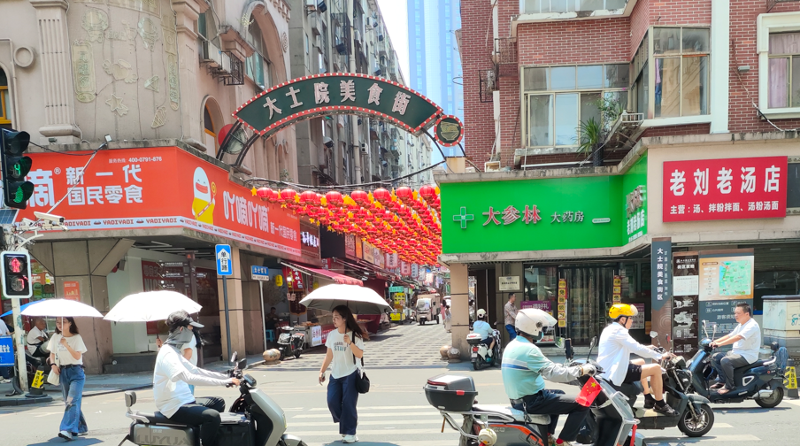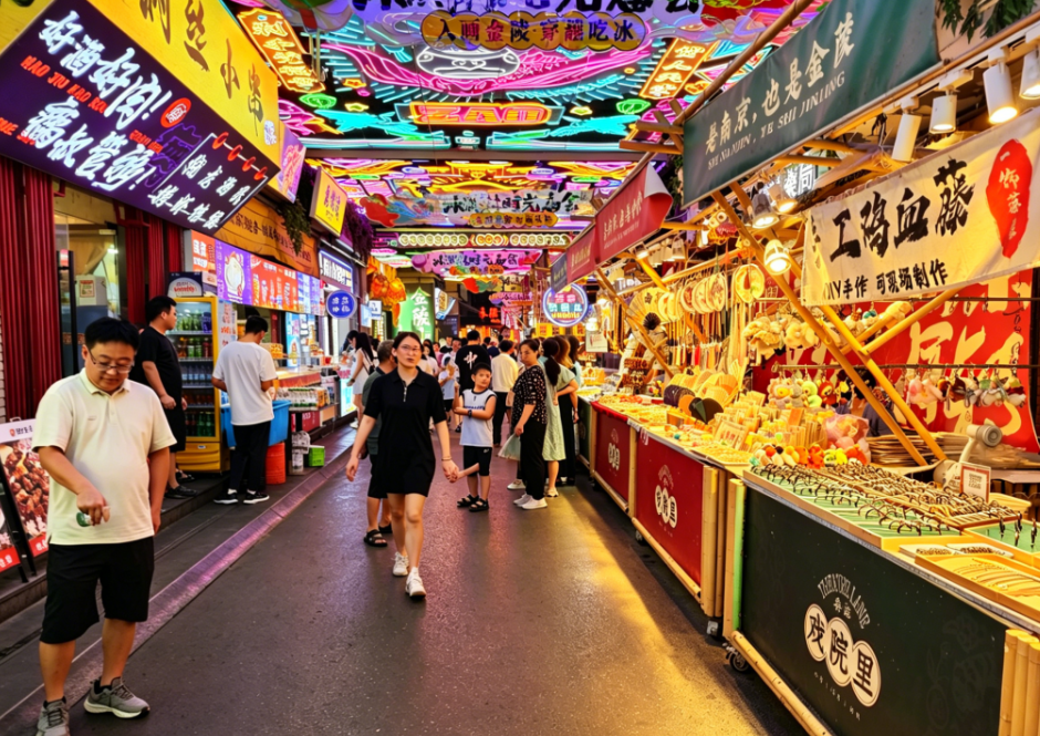 青石板路被往来的脚步磨得发亮,街边的小店飘着糖粥和卤味的香气,随处可见的桂花酿的招牌,叫卖声、笑闹声混着游船的汽笛声,把夏夜的燥热都揉成了松弛的烟火气。