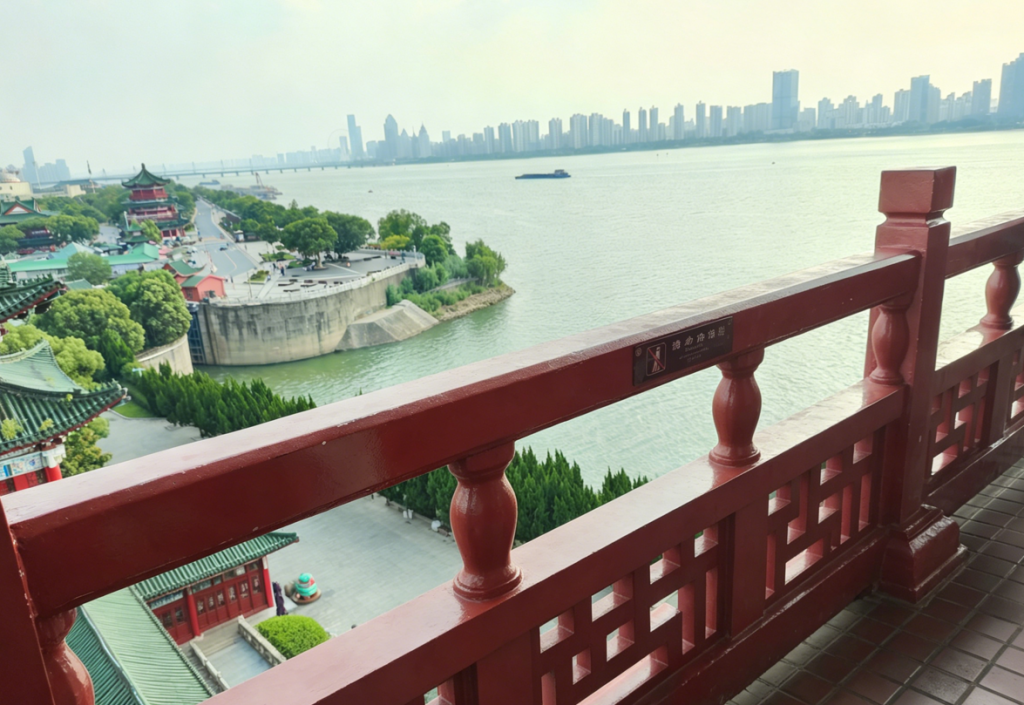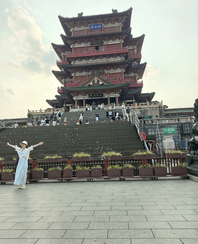 虽然天气很热,但是游客还是络绎不绝,中国最不缺的就是人。由于天气太热,室外的景点我们没有怎么逛,不过滕王阁内的每一层我们都逛了:最底层都是文创商店和特产店,上面每一层都围绕着滕王阁或者王勃的故事展出一些展品,像一个小博物馆。在滕王阁上也能欣赏江景,不过这不是诗中 “槛外长江空自流” 的长江,而是赣江,江风一吹,总算驱散了不少暑气。