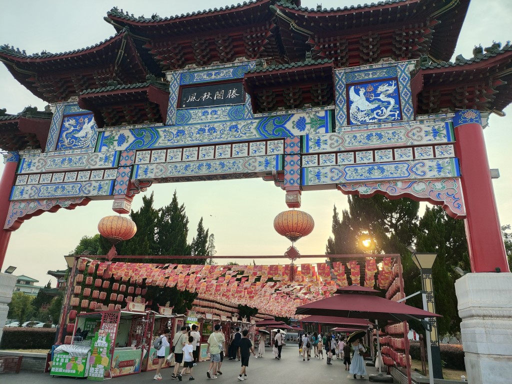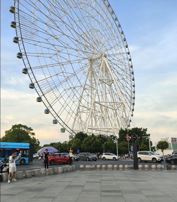 傍晚时分,我们穿过写着 “滕阁秋风” 的古色牌坊,搭乘网红铛铛车去了南昌之星摩天轮