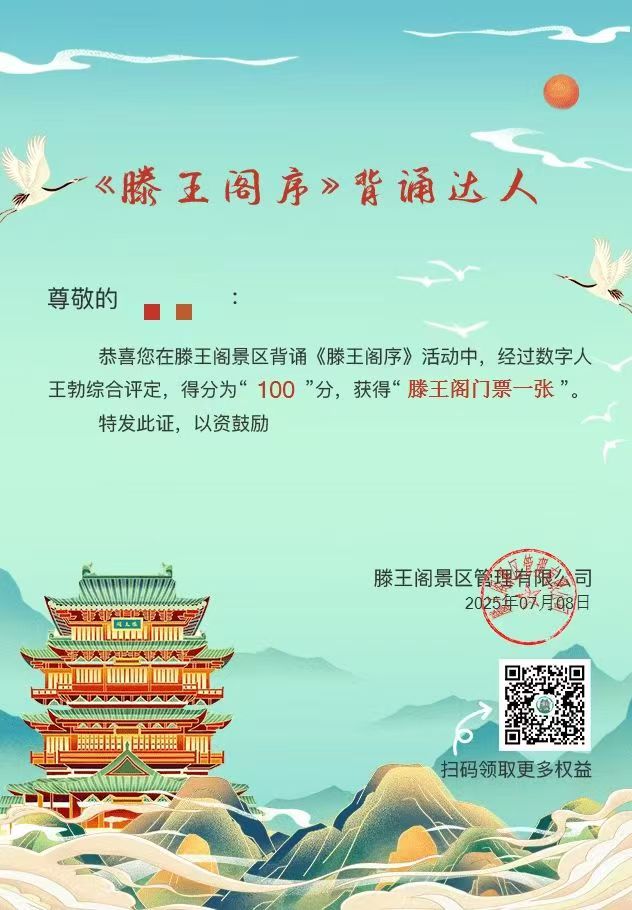 游客中心里排队背序的游客真不少,好多家长都是特意鼓励孩子过来挑战的。听说以前是对着工作人员背诵,现在基本都改成了电脑智能核验。因为我确实有点社恐,所以机器检查对我来说太友好了,顺利满分通过,免费兑换了一张门票,还拿到了《滕王阁序》背诵达人证书。这时候是下午 2 点半多,外面正热得厉害,怕景区里没有合适的乘凉休息的地方,我们在游客中心休息了一个多小时才进景区。