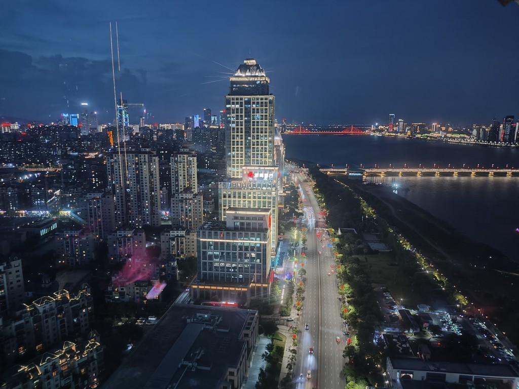 当南昌之星的吊舱缓缓升至半空,赣江两岸的灯火便次第铺展成一幅流动的璀璨画卷。脚下的红谷滩 CBD 率先亮出锋芒,中间那栋超高层写字楼的玻璃幕墙被霓虹点亮,像一柄直插夜空的光剑,周边的摩天楼宇连成一片灯海,金芒与蓝焰交织,把现代都市的蓬勃感拉满。沿江的快速路车流如织,车灯汇成一条金色的河流,沿着赣江蜿蜒向前,分不清哪是车灯哪是路灯,只觉得整座城市都在呼吸、在流动。