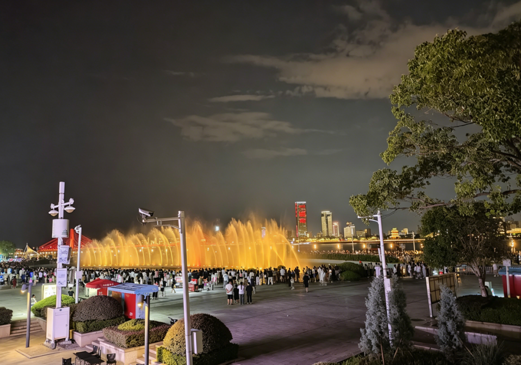 到达秋水广场时,广场上已经人头攒动,赣江晚风轻轻拂去昼间的炎热,音乐喷泉如约登场。前奏响起,水柱试探着升起;旋律激昂时,数十股水柱冲天而起,最高处似要触碰远处的南昌之星,灯光雕琢下,银白巨塔轰然散落,水雾沁凉,扑在脸上格外舒服。