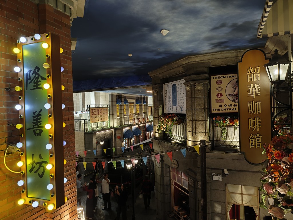 一进民国馆,瞬间就被拉回了老南京的街巷里。蓝灰色的天空顶、仿旧的路灯、彩色三角旗,还有各种民国风格 的招牌,连 “灯牌都带着旧时光的味道。孩子们在这里看了又看,一会儿停在老汽车模型前,一会儿趴在栏杆上看街景,我们沿着街巷慢慢走,感受着老南京的烟火气。