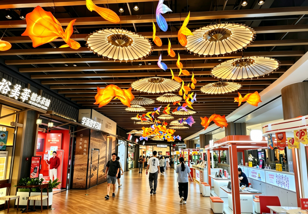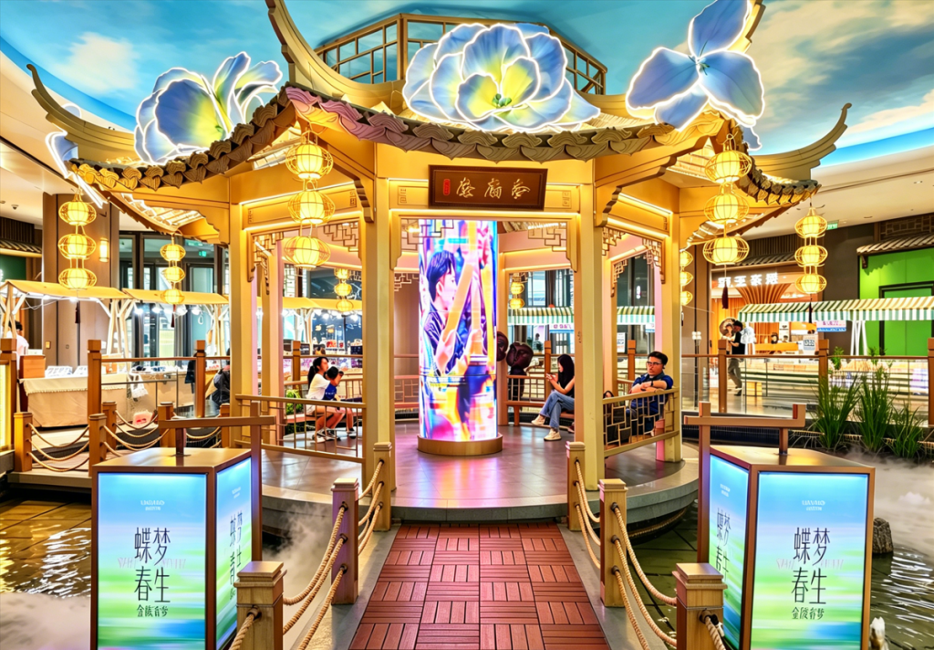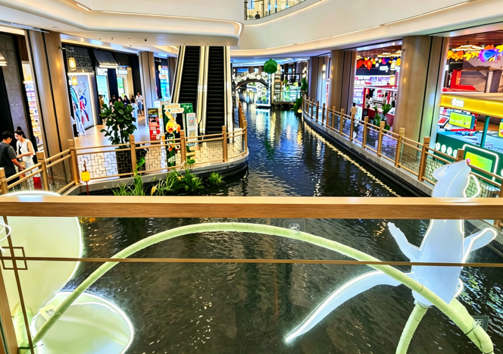一进商场就被惊艳到了 —— 挑高的中庭里,橙色、蓝色的鱼形灯饰悬在半空,像一群游弋的锦鲤,搭配着伞状吊灯,氛围感十足。我们顺着中庭往里走,有不少适合孩子逛的小店。商场里藏着一个叫 “蝶梦春生・金陵壹梦” 的主题区,仿古建筑的亭子架在水面上,周围水雾缭绕,像闯进了江南园林里。孩子们在这里玩得不肯走,一会儿在桥上比耶拍照,一会儿趴在栏杆边看水里的鱼。我们一直逛到下午四点多,才恋恋不舍地离开。