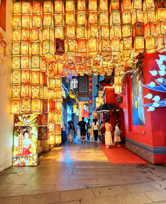 街边的灯笼墙在头顶铺开,绘着脸谱和瑞兽的灯盏连成一片星河。一路从街市逛到河畔,从华灯初上走到月色爬满梢头,眼里是游人如织的热闹,心里装着满当当的温柔。