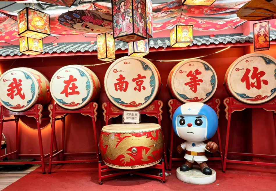 拐进了藏着小惊喜的文创角落,枫叶垂下来的枝桠上挂着满满的许愿牌,“慢慢人生路,不走回头路” 的标语让我也会心一笑。再往前走,“我在南京等你” 的大鼓成了天然的打卡点。
