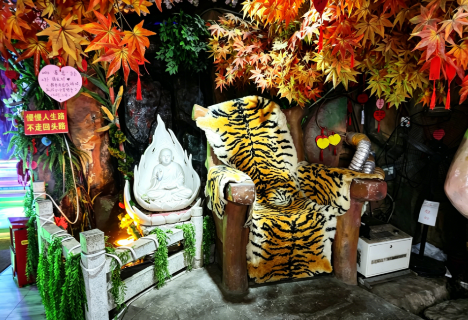 九天洞的入口镶嵌在山体之中,周围绿树环绕。需要爬一段山路才能到达洞口,我们听从了工作人员的建议,买了一个魔毯票,坐魔毯上去,一个人只需要10元。其实这段山路并不长,爬上去也就10来分钟。