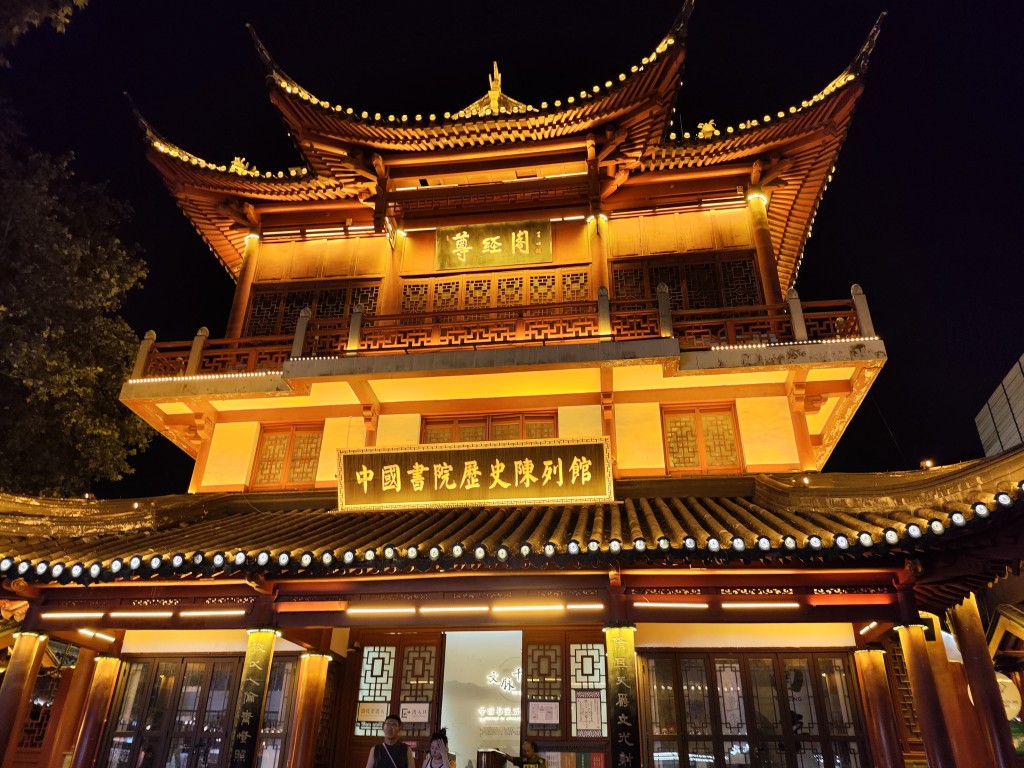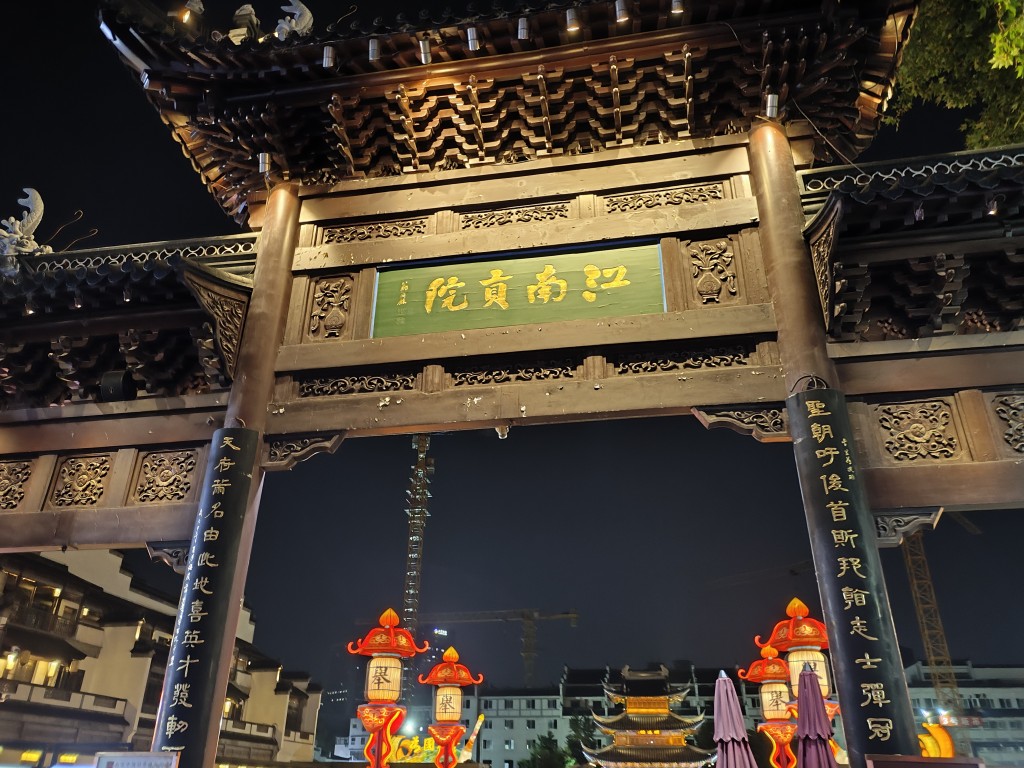 再往深处走,江南贡院的牌坊在夜色里格外庄重,朱漆木坊上的楹联被灯光照得发亮,忽然就想起从前这里挑灯夜读的书生,如今这里成了满是打卡声的热闹地,时光在古建上叠了一层又一层的故事。不远处的尊经阁飞檐翘角,暖黄的灯光把雕梁画栋的纹路都照得清晰,连风里都好像沾了点书卷的墨香。