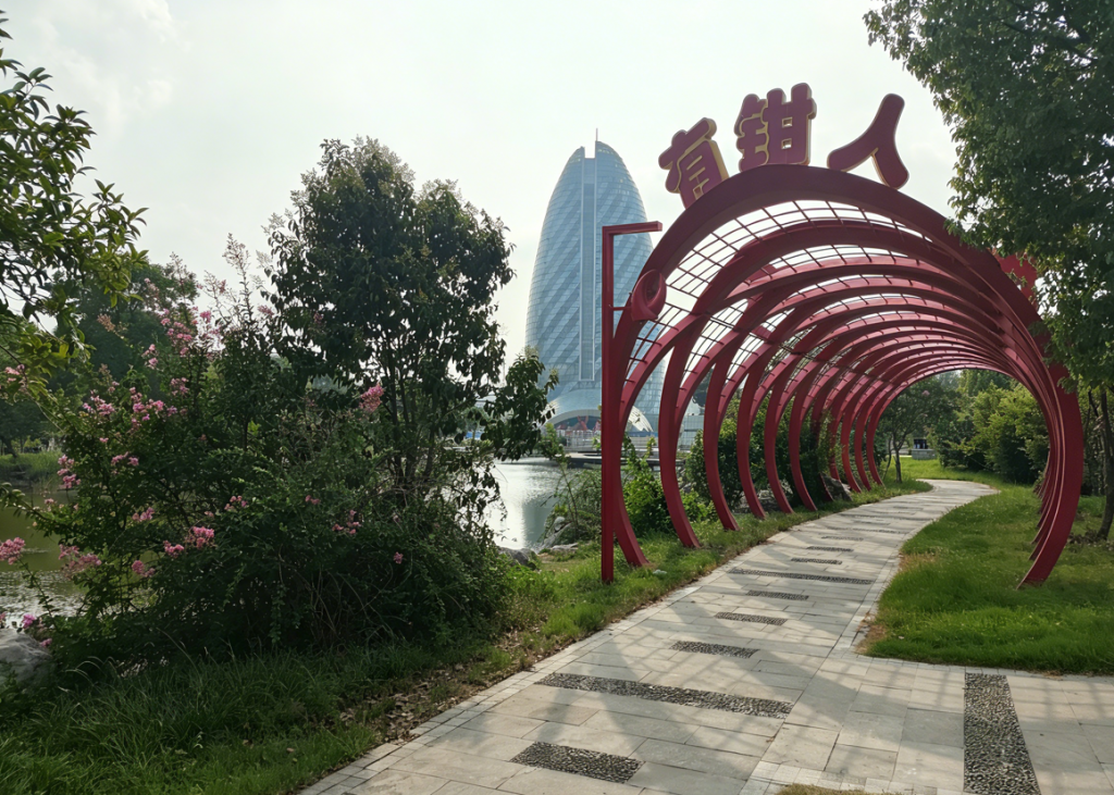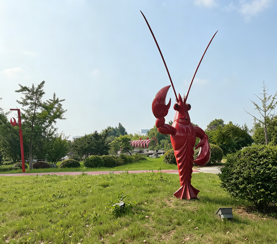 往前走,路边的公园更是被小龙虾元素 “承包” 了,红色的龙虾造型长廊上,写着 “有钳人” 的字样,连路边的公厕外墙上,都画着可爱的小龙虾涂鸦,公园里有各种龙虾的小品建筑,甚至连公园里的路灯都是虾钳的形状。我晚上入住的酒店停车场的门口,一般都是放两座石狮子的,这里放了两座大龙虾。