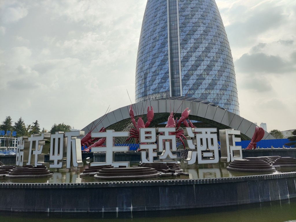 远处的高楼,也被打造成了龙虾主题酒店,玻璃幕墙的建筑前,几只大龙虾雕塑格外显眼,整个盱眙,好像都在向小龙虾 “致敬”,每一处细节都在诉说着这座小城对小龙虾的偏爱。