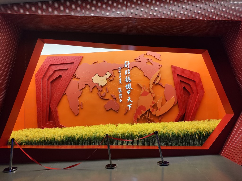 龙虾博物馆总共有三层,一楼大厅很空旷,应该是为展销会和活动预留的空间。上二楼的扶梯也很特别,孩子大喊我们进了龙虾肚子里了,到了二楼,一抬头就能看见 “盱眙龙虾甲天下” 的标语,搭配着世界地图和金灿灿的稻田造景,一下子就把盱眙龙虾的底气亮了出来 —— 这里不仅是龙虾的故乡,更是把小龙虾做成了走向全国的大产业。
