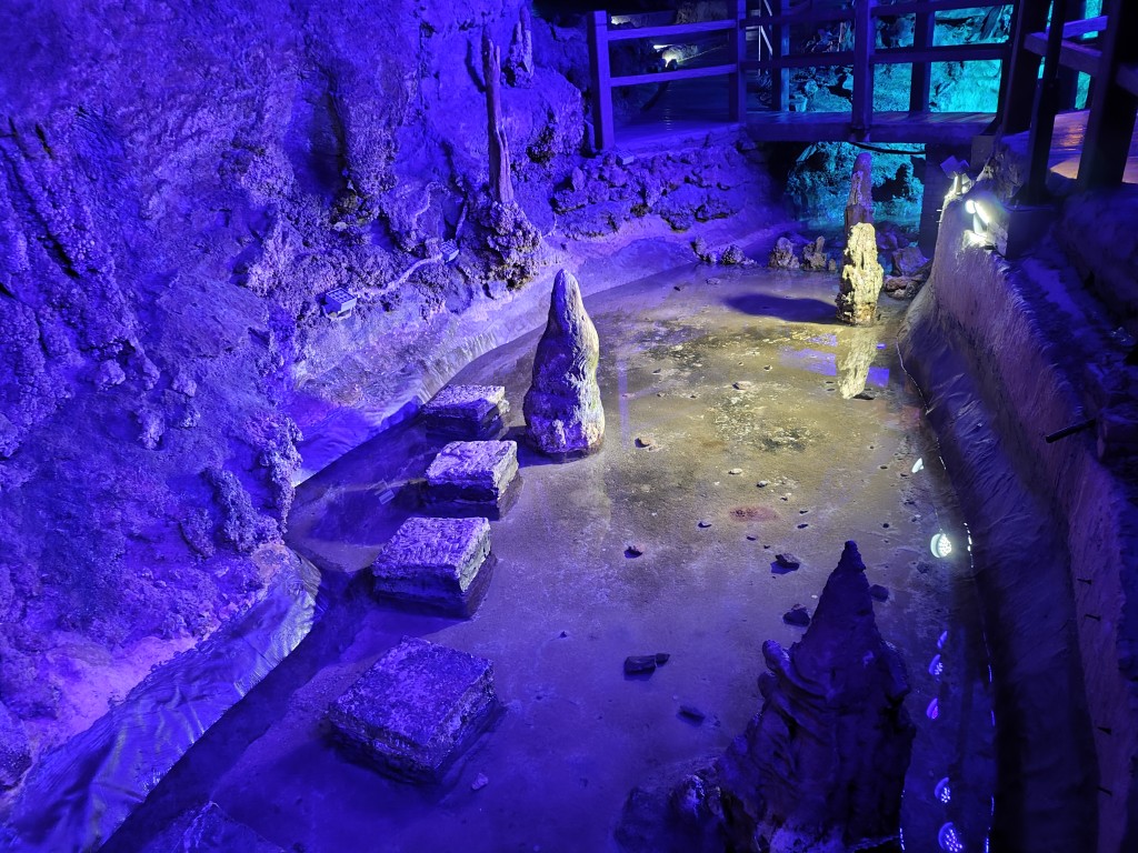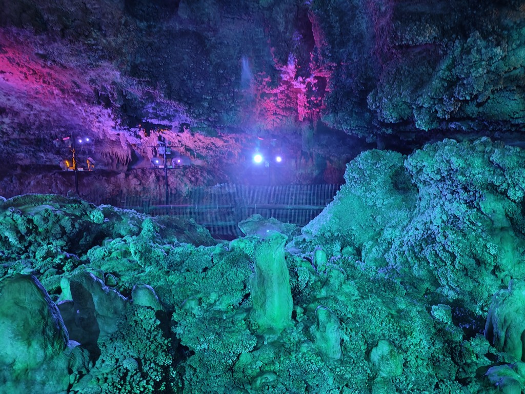 昼短苦夜长,何不秉烛游!这个时间恰好是逛溶洞的时候,洞顶的钟乳石在幽蓝、翠绿的灯光映照下,宛如海底的珊瑚丛,散发着神秘的气息。岩壁上的历代题刻,在昏黄的灯光下若隐若现,仿佛在诉说着往昔文人墨客在此留下的风雅。