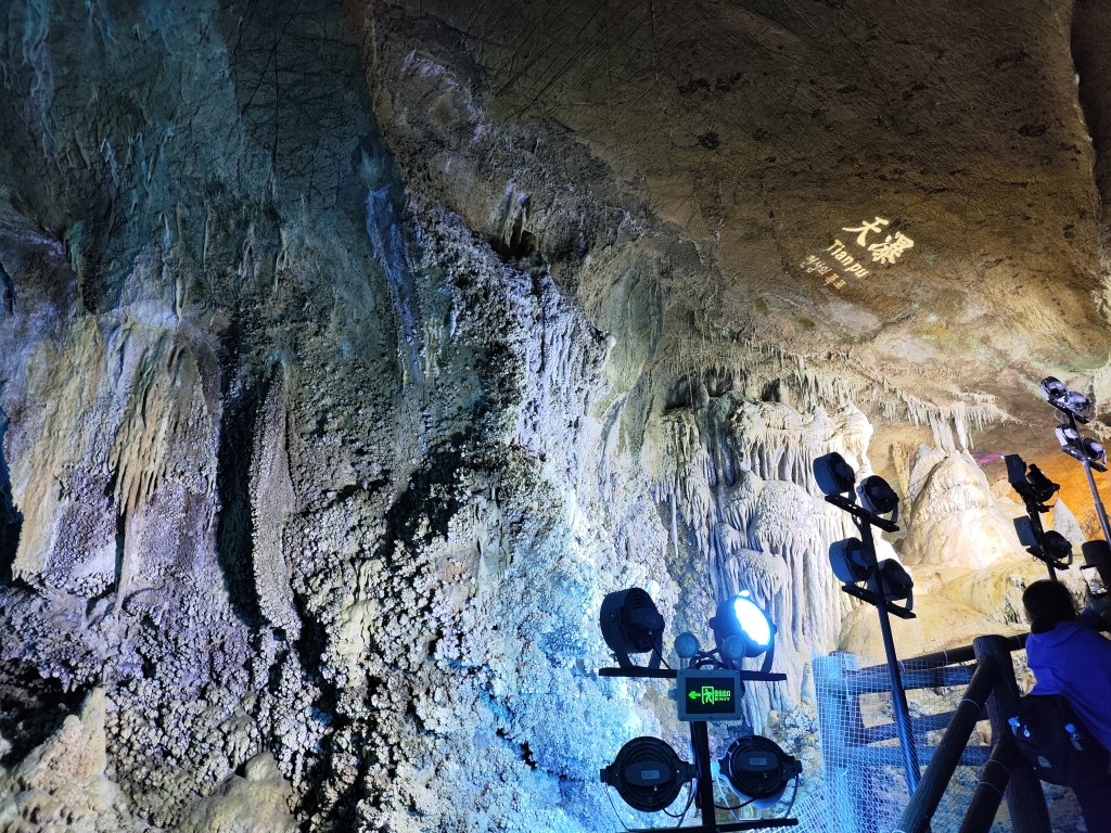 再往后走,天河厅的景观让人眼前一亮。一条长长的石带宛如天河一般,在灯光的照射下,闪烁着粼粼波光。而天宫厅则是九天洞中最壮观的厅室之一,巨大的石柱支撑着洞顶,石花、石莲点缀其间,如同天宫中的琼楼玉宇,美轮美奂。