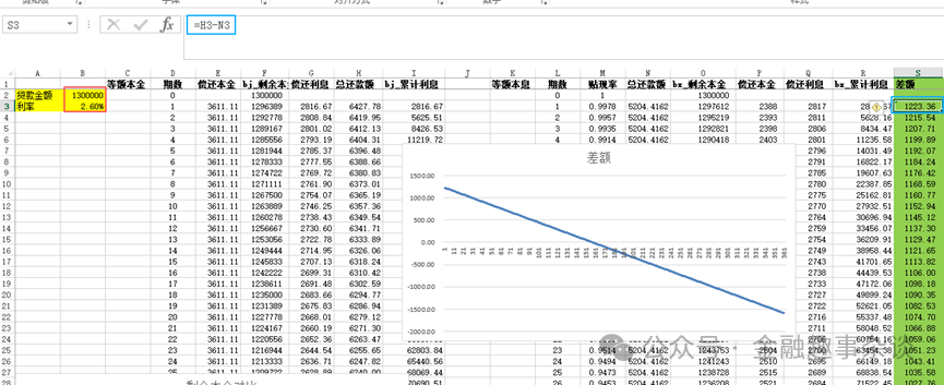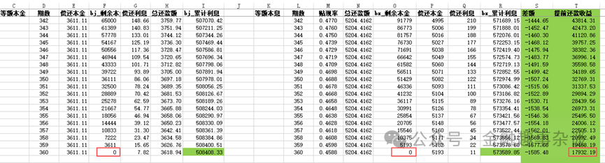 假设我们不仅可以提前还商贷,还可以把公积金等额本息前期少还的资金(即S列的数字)放在一个独立的账户存起来、利率与商贷利率(每月3.05%/12)一致。那么实际上我们把这些钱提前还贷,或者放在此账户里存起来,两种选择是无差异的,因为二者投入的本金和生息的速度都是一样的。不过,当我们想象成后者时更容易理解T列的计算过程:前期等额本息的方式可以少还,把少还的资金存到利率更高的账户去赚收益;到了后期等额本息还的比等额本金更多时,就把账户里的钱取出来支付多还的部分。直到贷款结清为止,账户里还剩余17932.19元,这便是公积金贷款选择等额本息而非等额本金产生的收益。