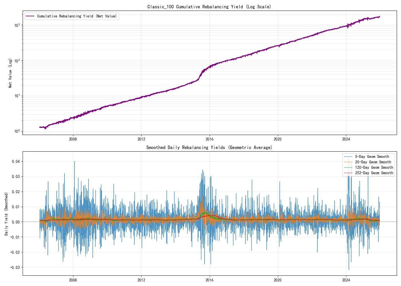上图是对数坐标下的累计调仓收益率,下图是不同窗口下几何平均的日调仓收益率