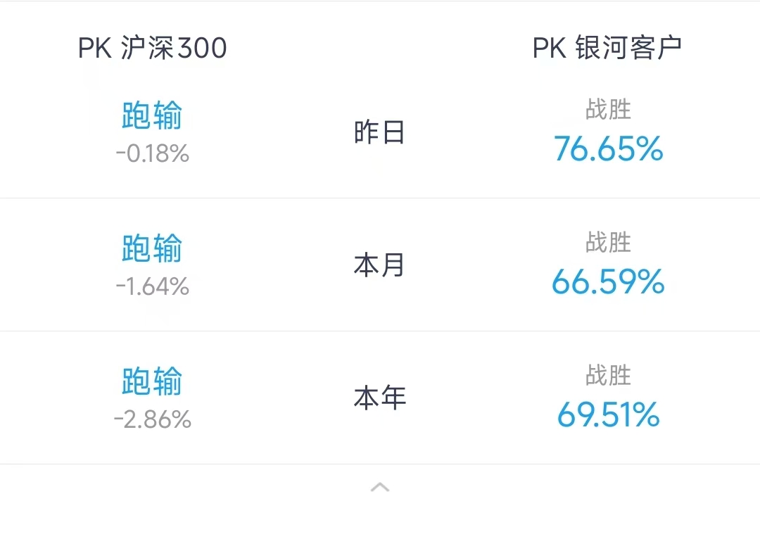 3. 投资方面,今年的收益率在15%左右,比沪深300能低3个点吧(贴个图作为附件,2025年度只超过了69%的银河股友)。我还有另外两个小账户,加起来的总体收益能达到20%,也是相当满意了。个股方面,盈利前三是农业银行、黄金ETF和科创50ETF。