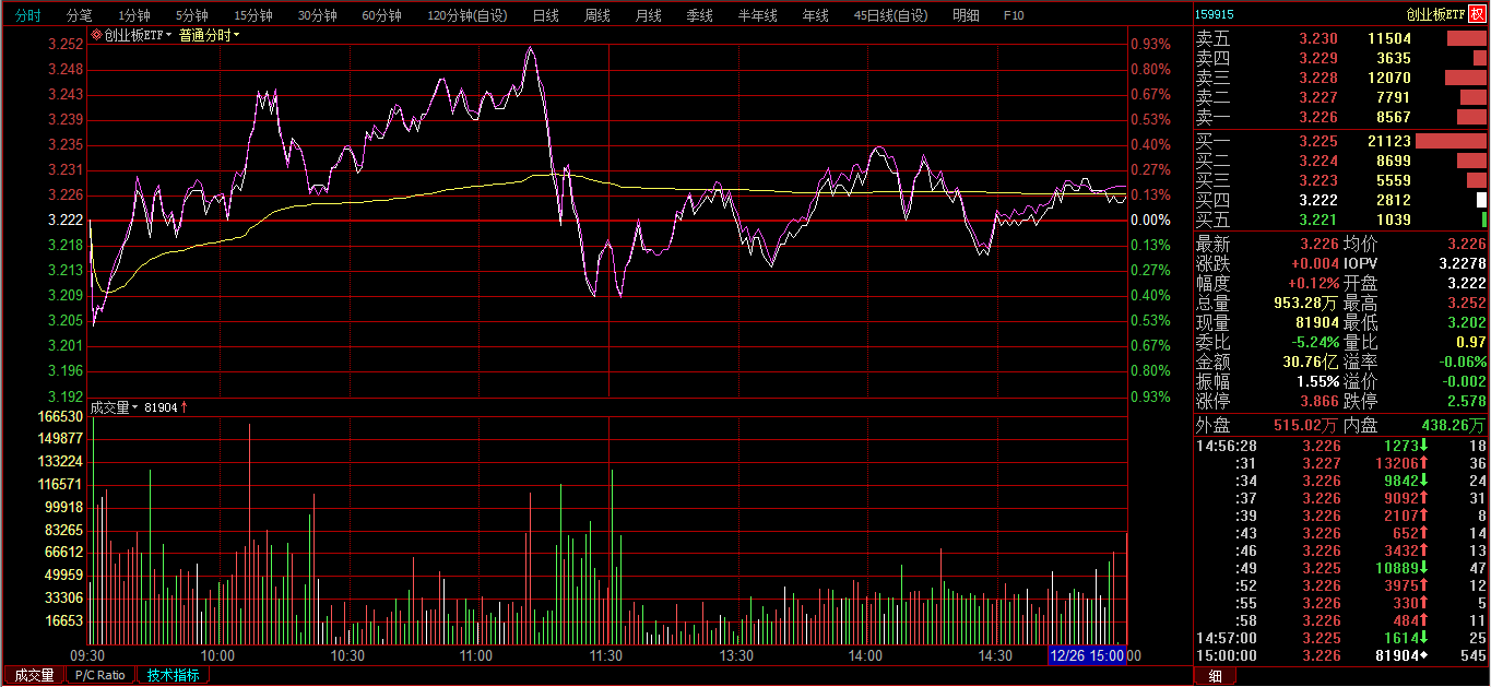 创业板ETF涨0.004,收于3.226,创业板ETF波指涨0.42,收于24.60。