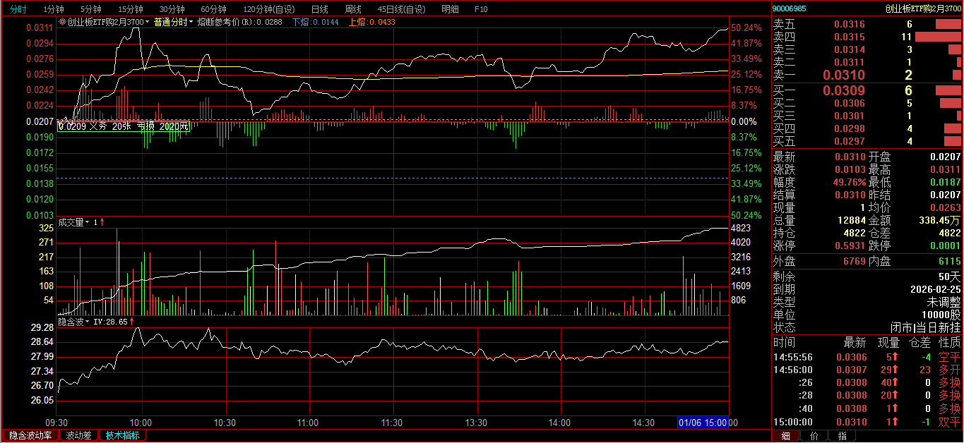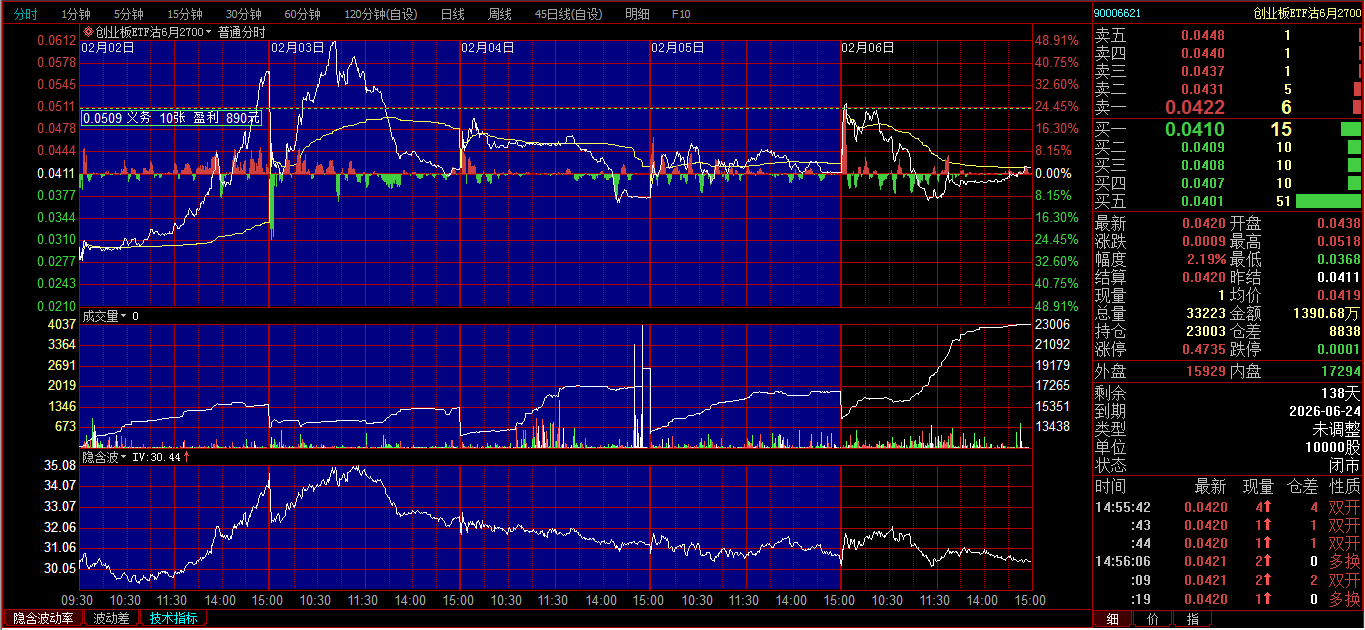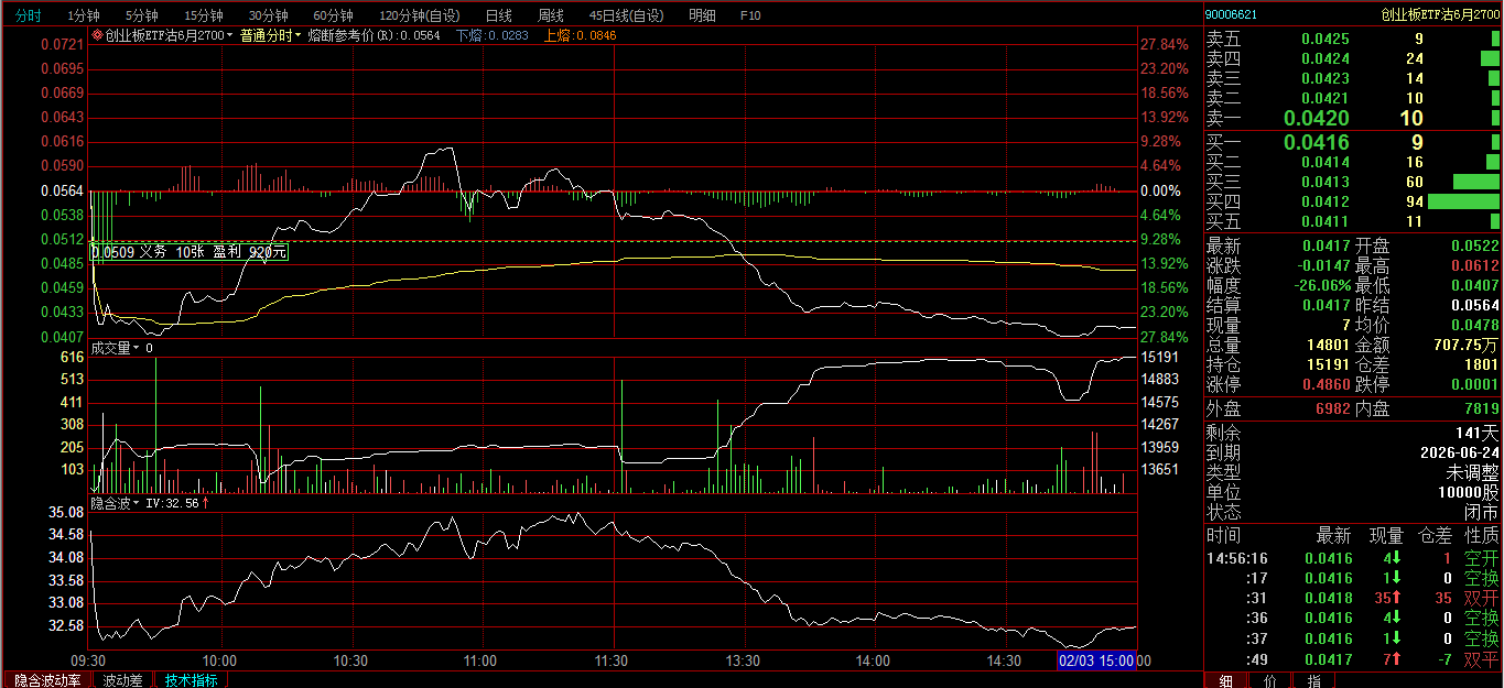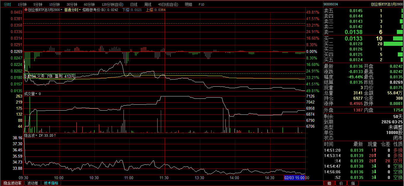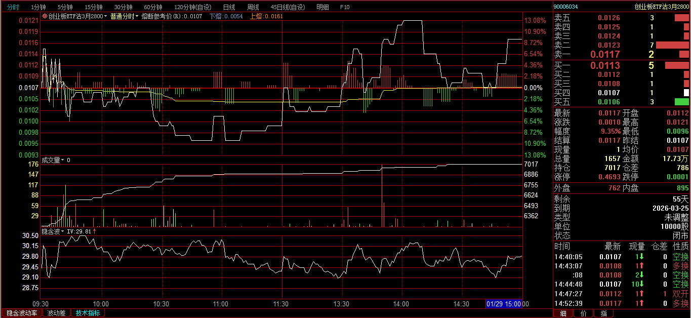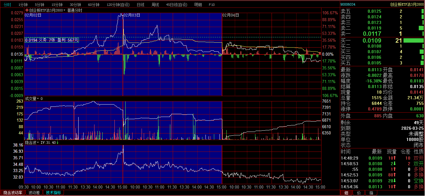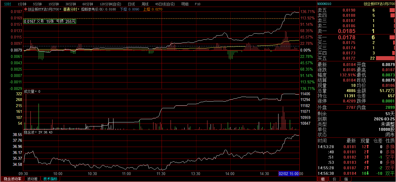 创业板ETF购2月3600卖开4张,成交价0.0239、0.0256、0.0297、0321;创业板ETF购3月3700卖开2张,成交价0.0385、0.0437。
