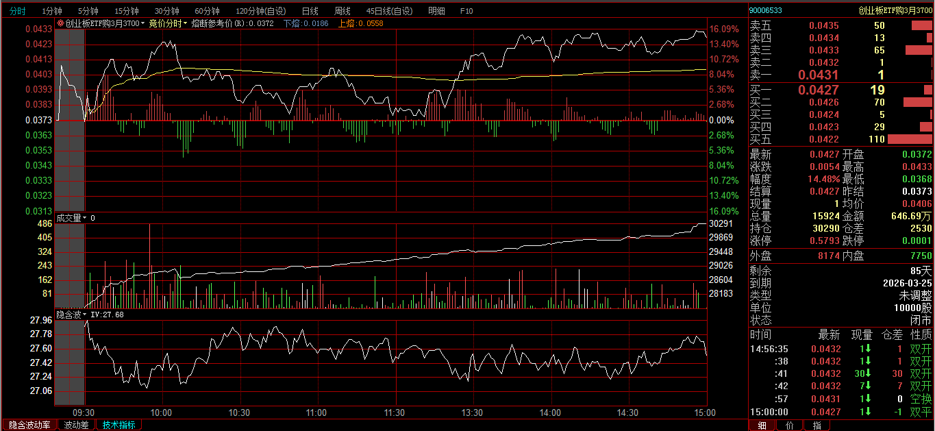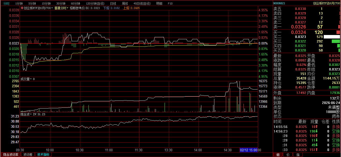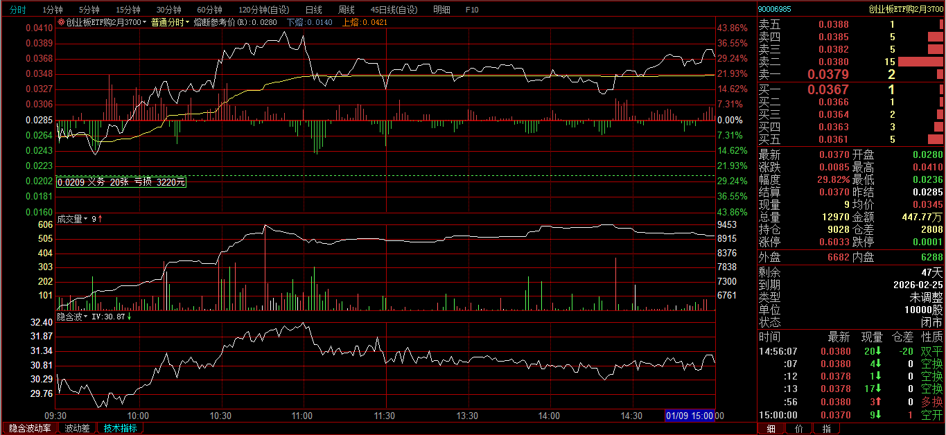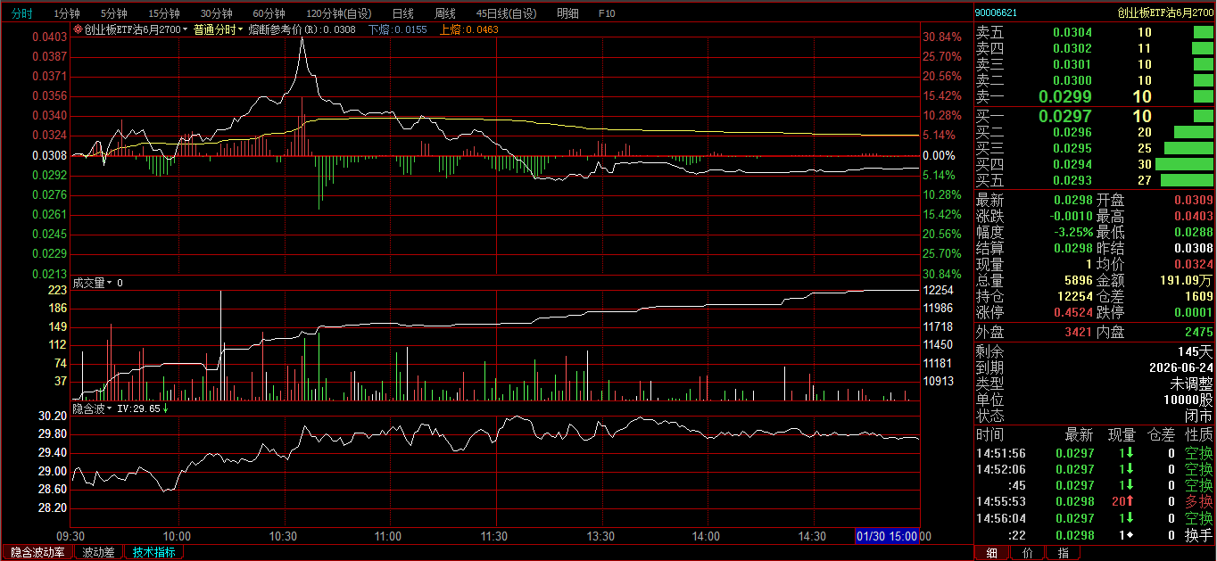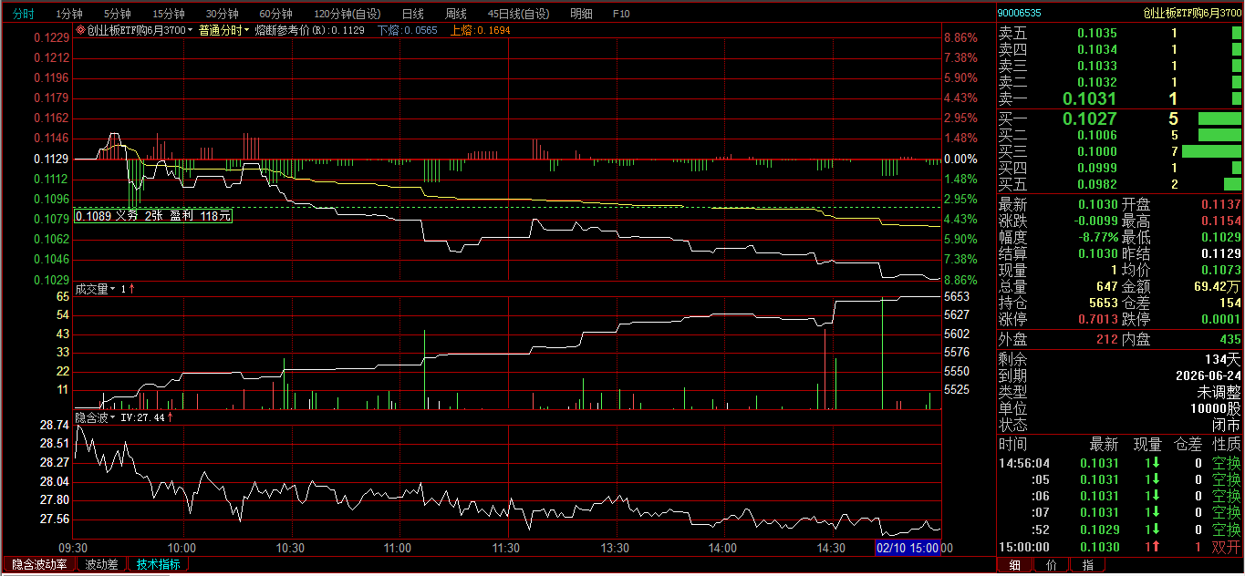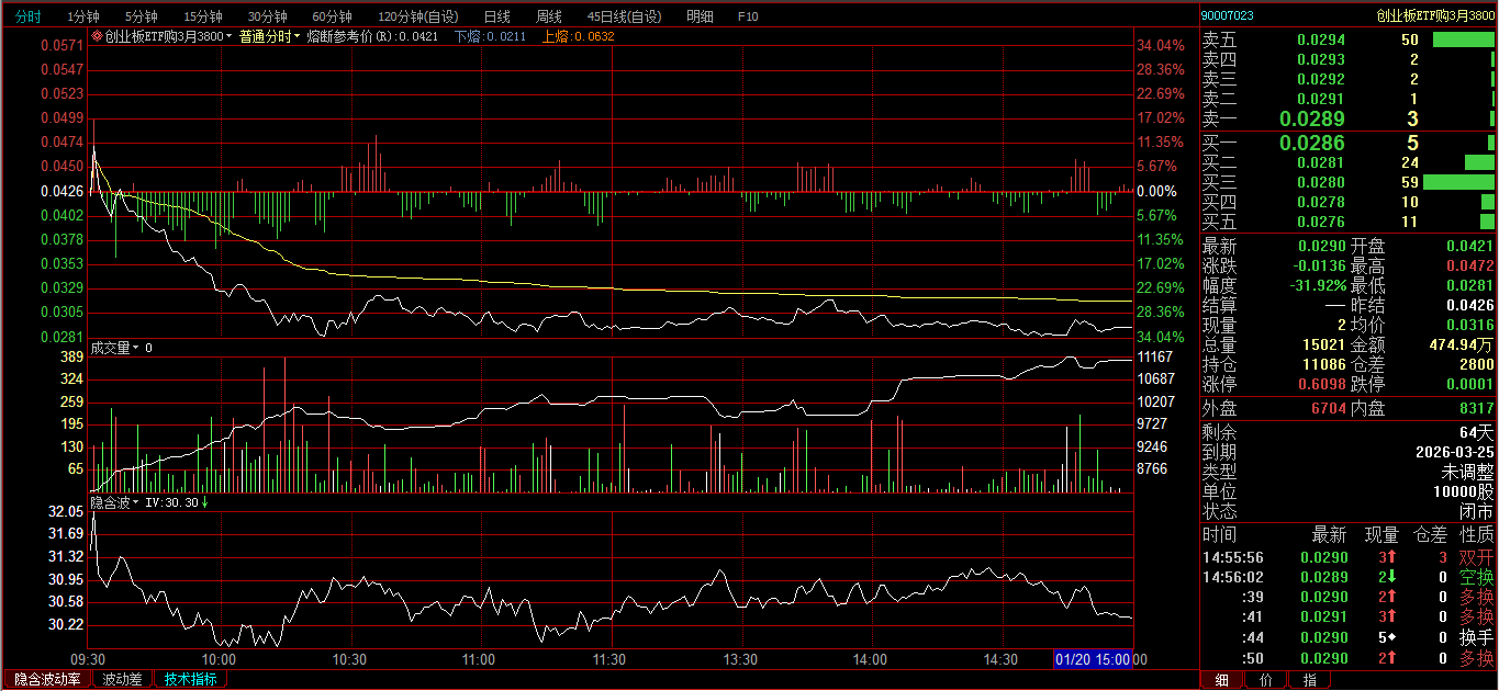 创业板ETF购2月3600卖开4张,成交价0.0239、0.0256、0.0297、0321;创业板ETF购3月3700卖开2张,成交价0.0385、0.0437。