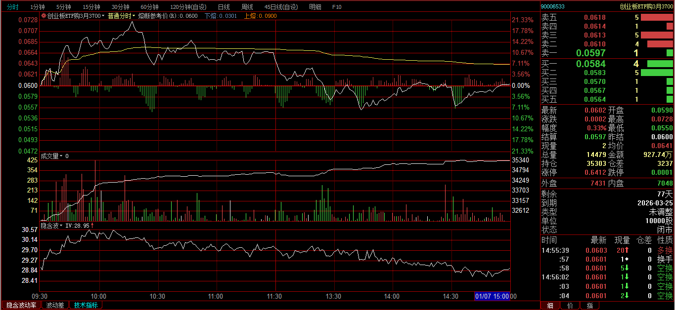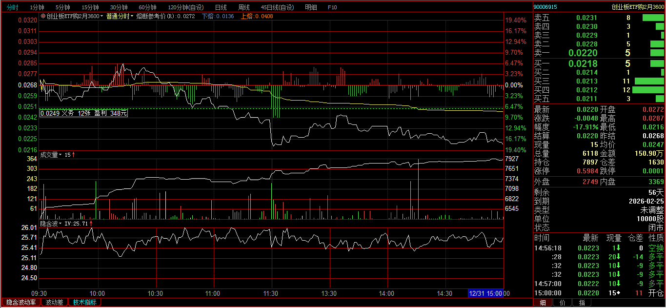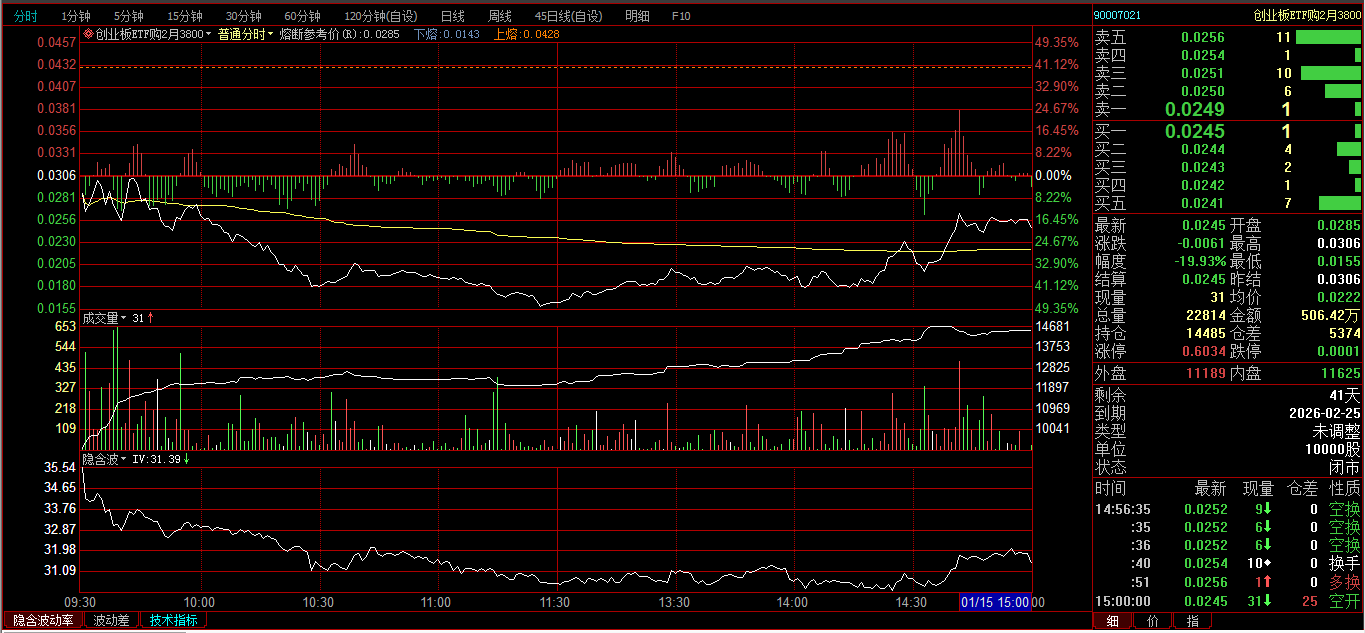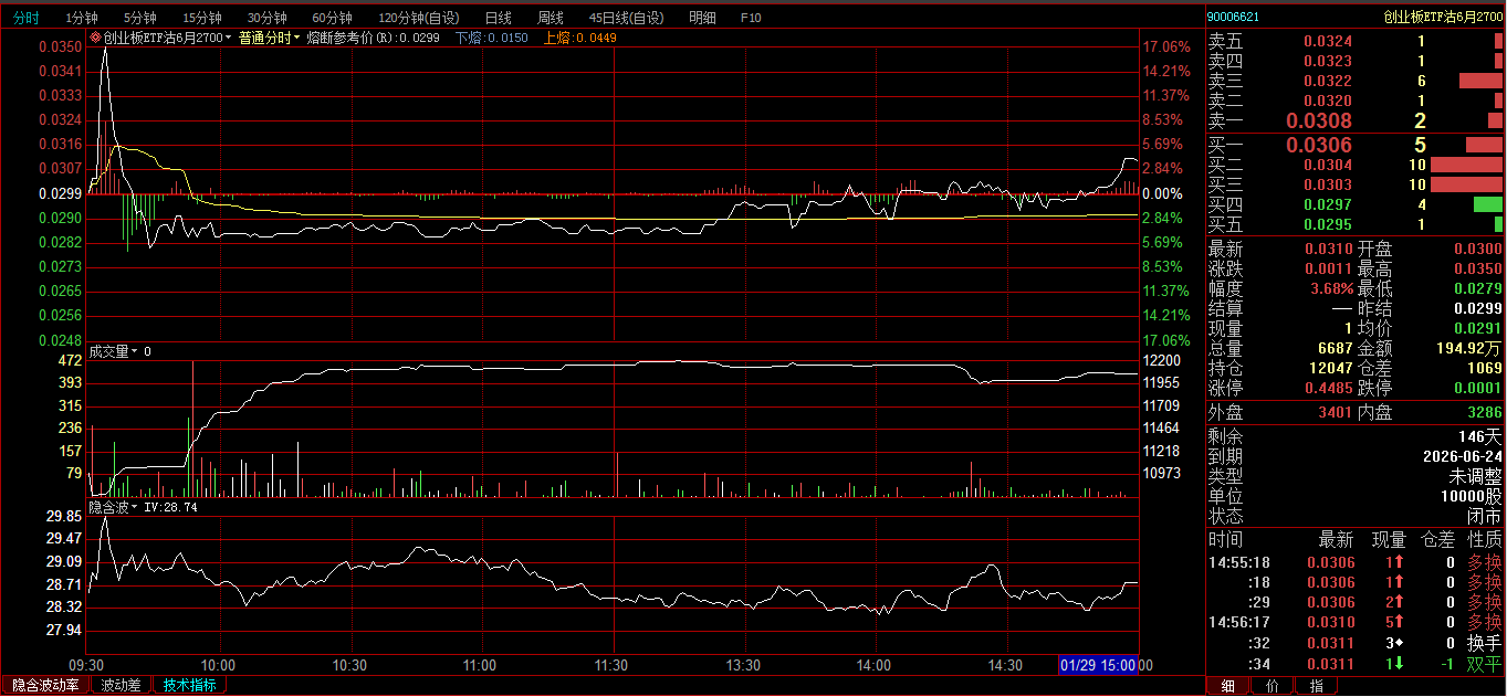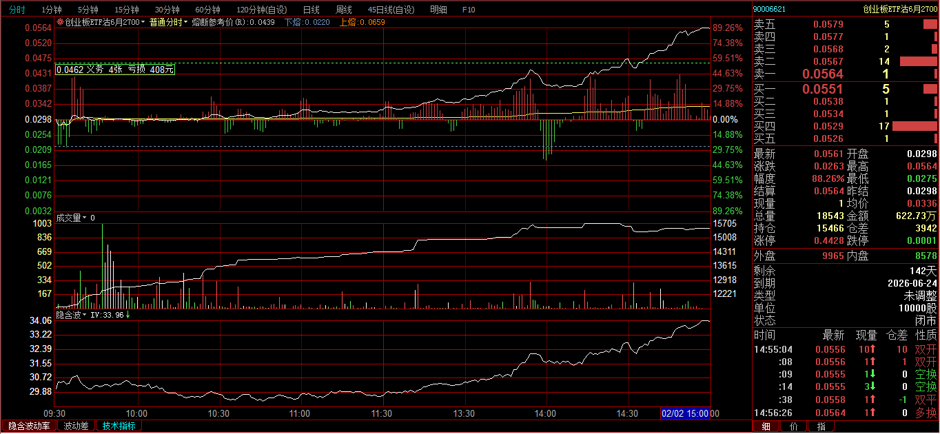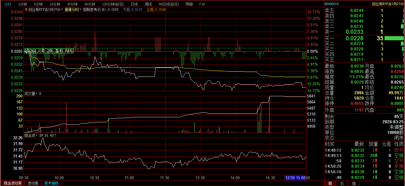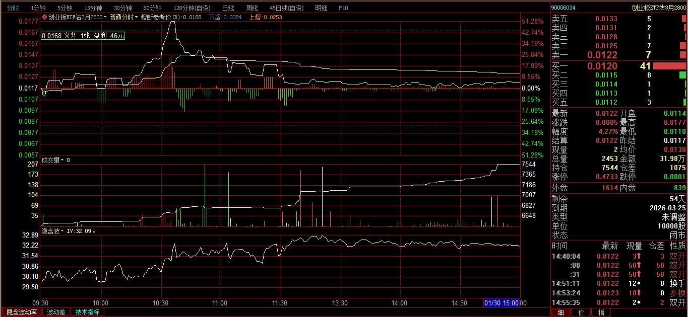 创业板ETF购2月3600卖开4张,成交价0.0239、0.0256、0.0297、0321;创业板ETF购3月3700卖开2张,成交价0.0385、0.0437。