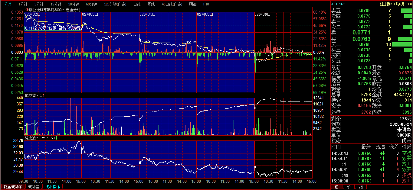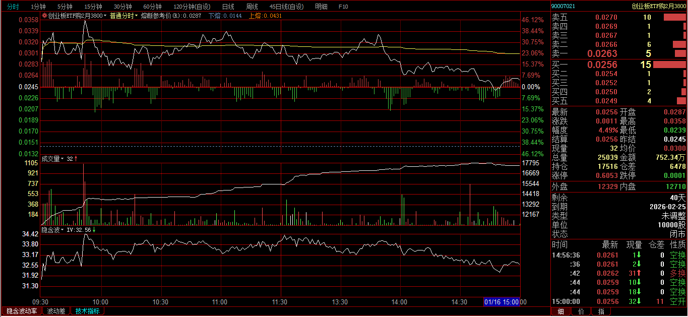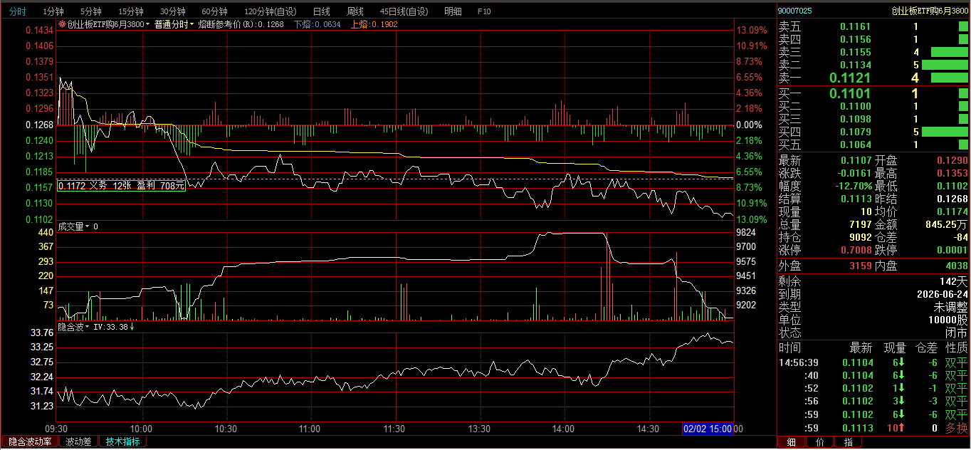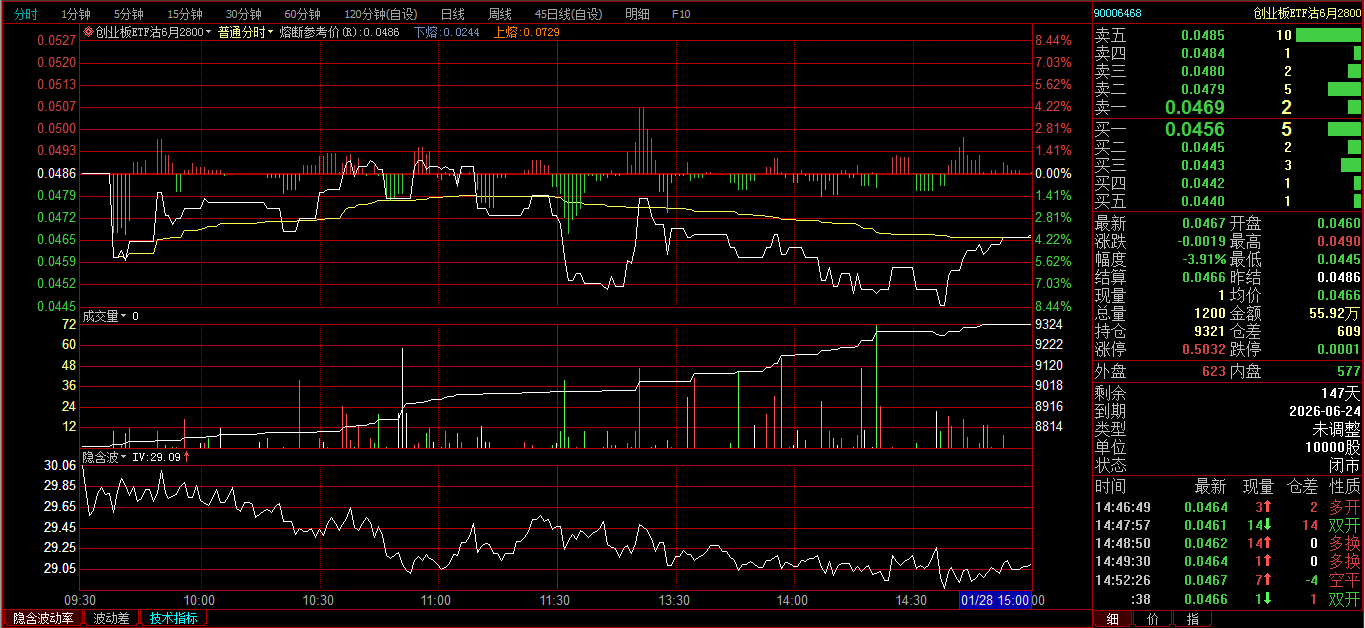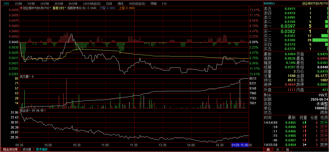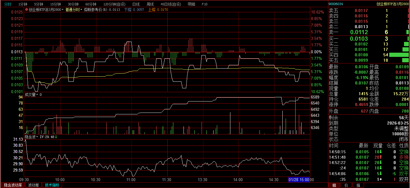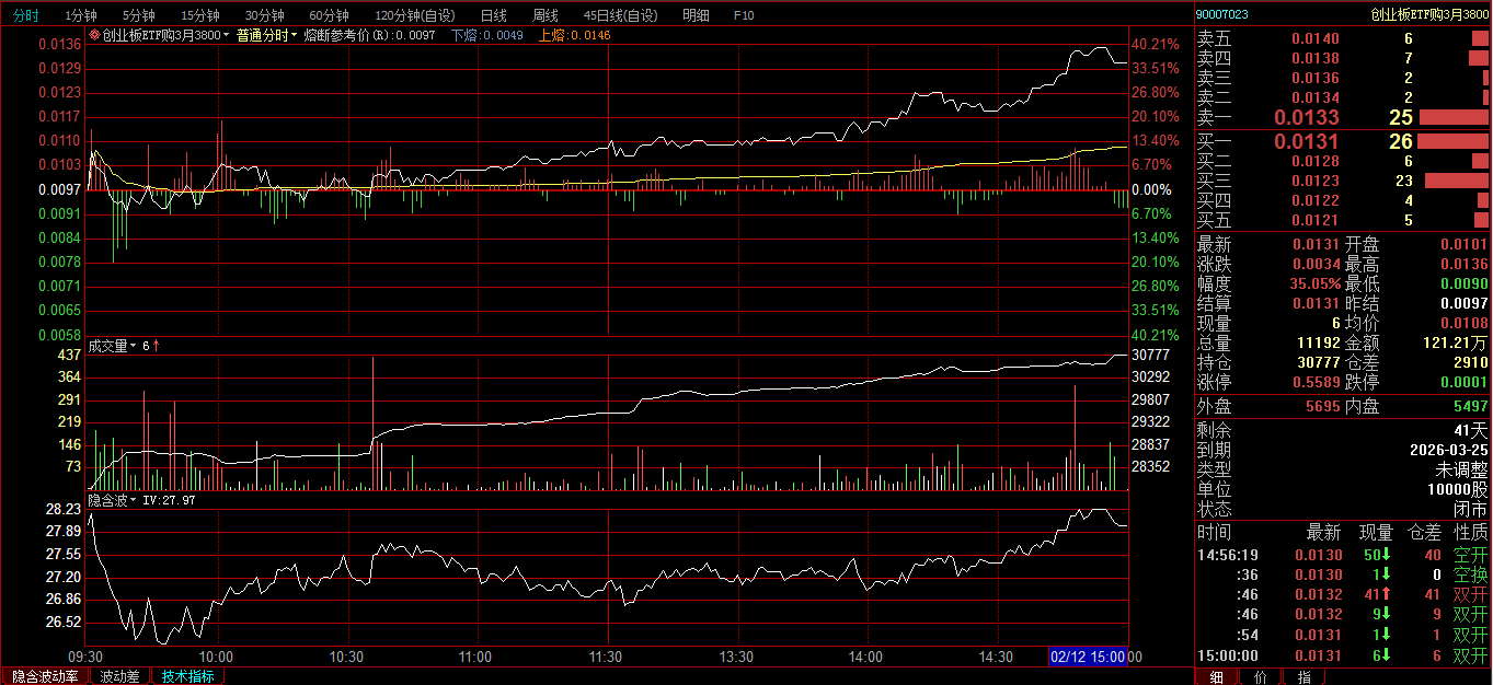 创业板ETF购2月3600卖开4张,成交价0.0239、0.0256、0.0297、0321;创业板ETF购3月3700卖开2张,成交价0.0385、0.0437。
