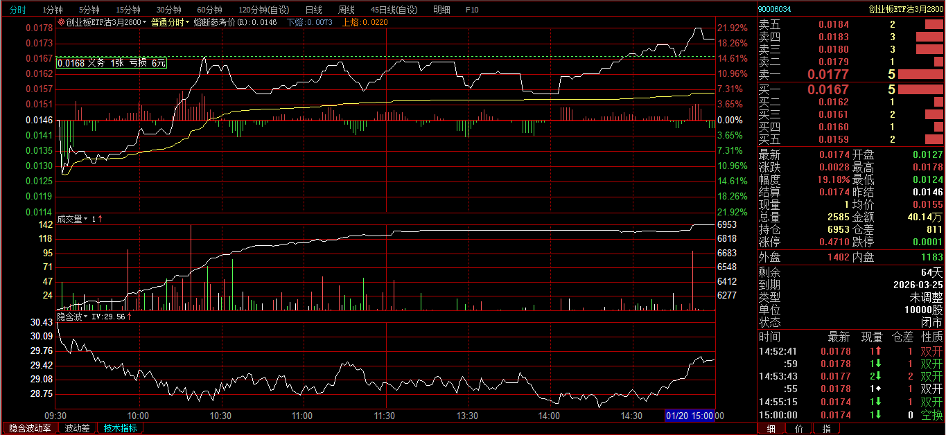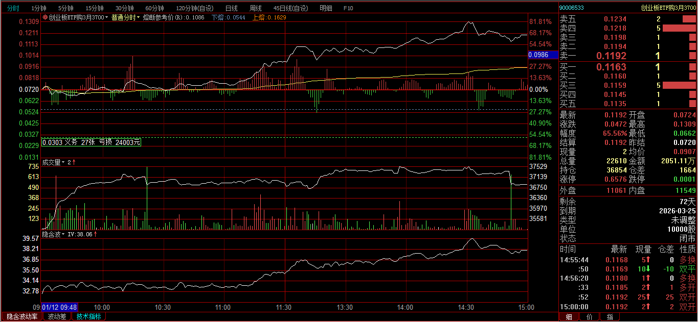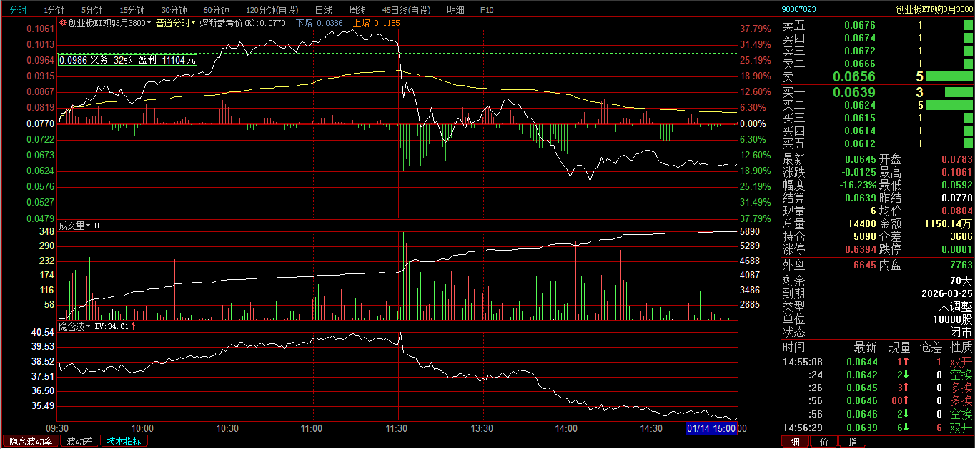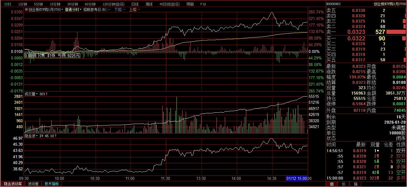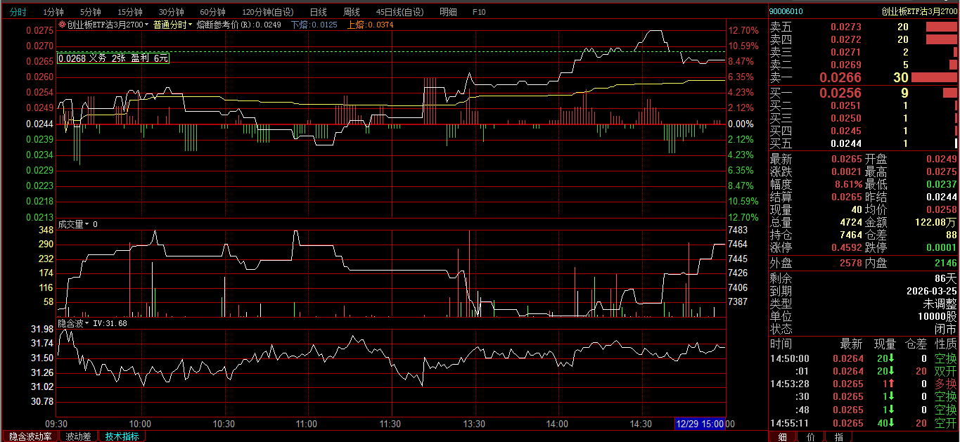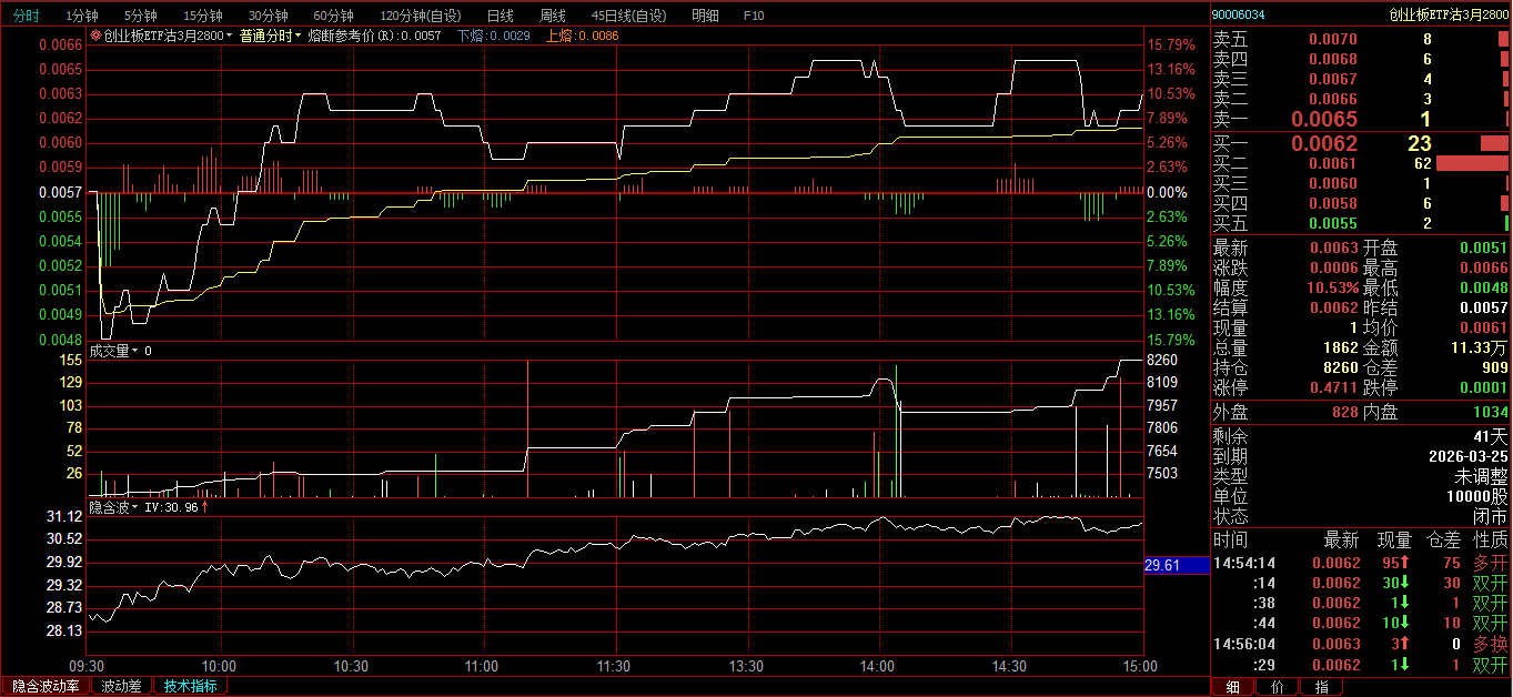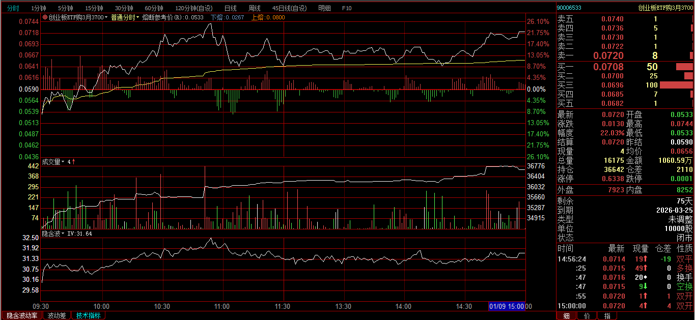 创业板ETF购2月3600卖开4张,成交价0.0239、0.0256、0.0297、0321;创业板ETF购3月3700卖开2张,成交价0.0385、0.0437。