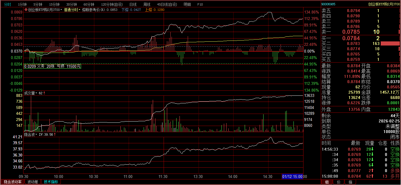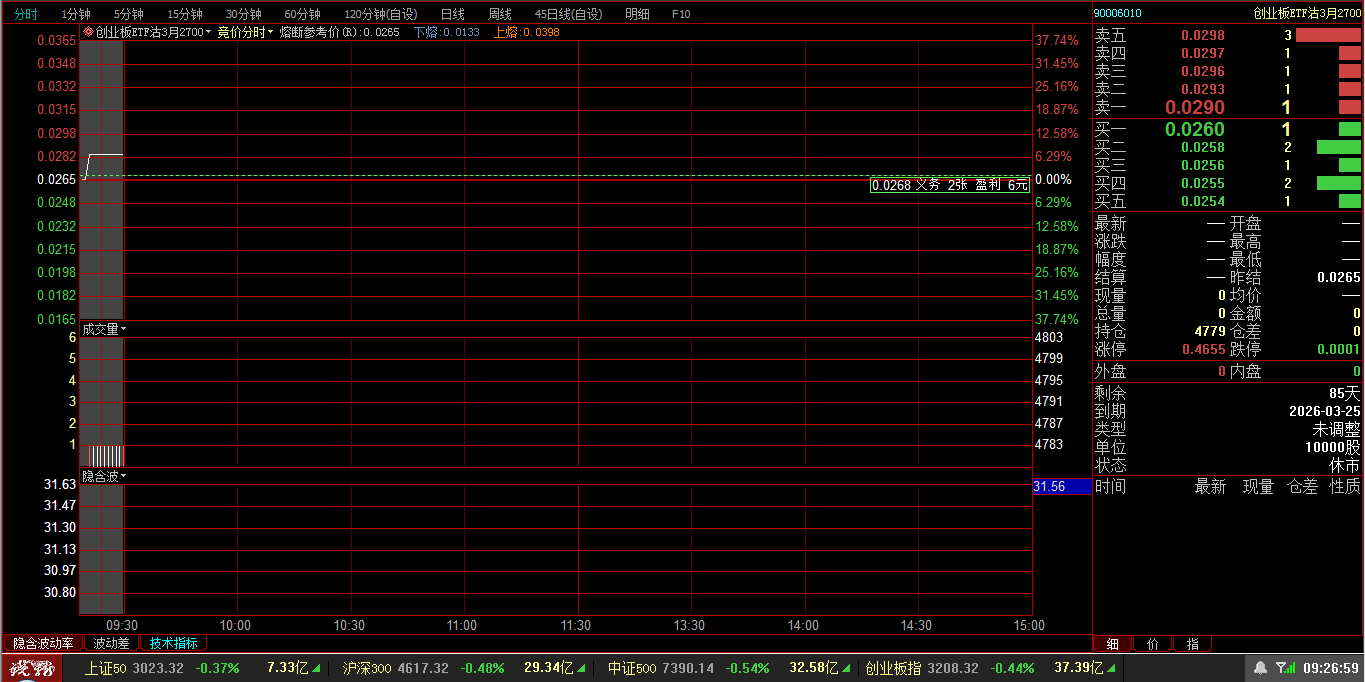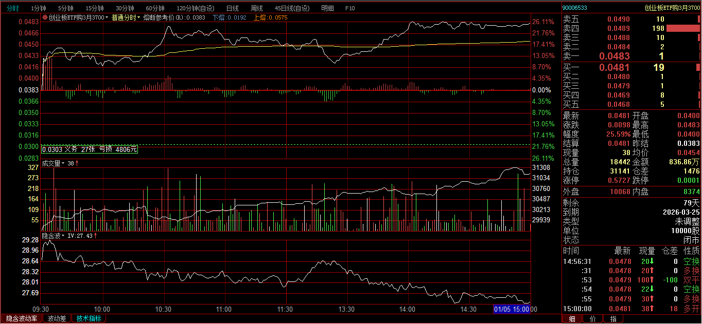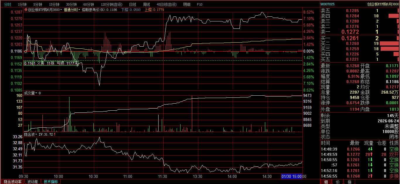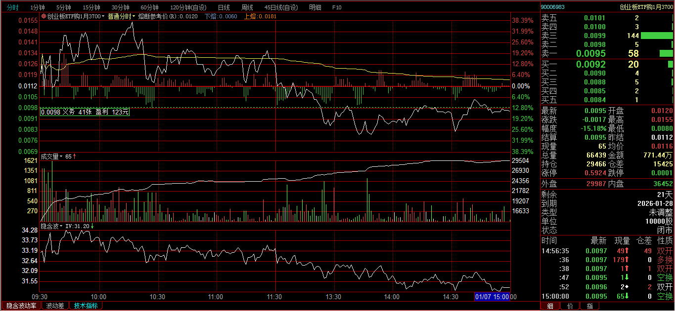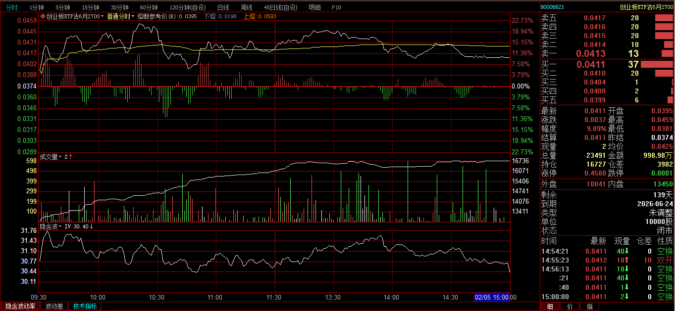 创业板ETF购2月3600卖开4张,成交价0.0239、0.0256、0.0297、0321;创业板ETF购3月3700卖开2张,成交价0.0385、0.0437。