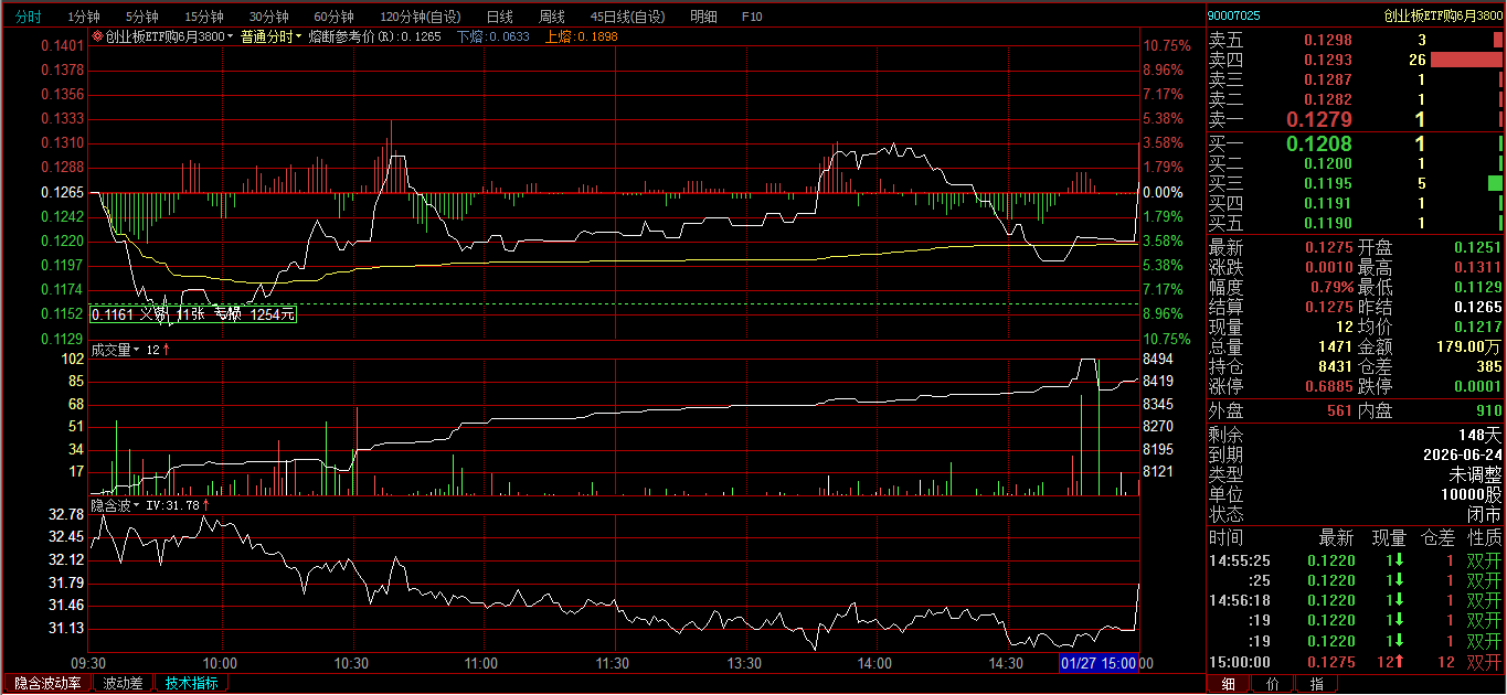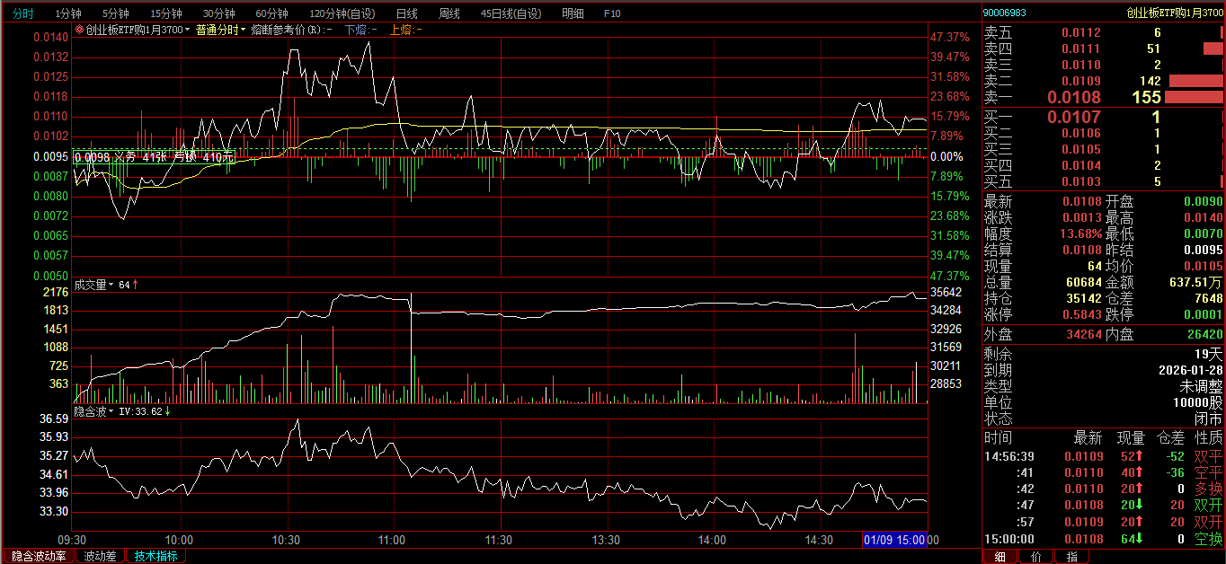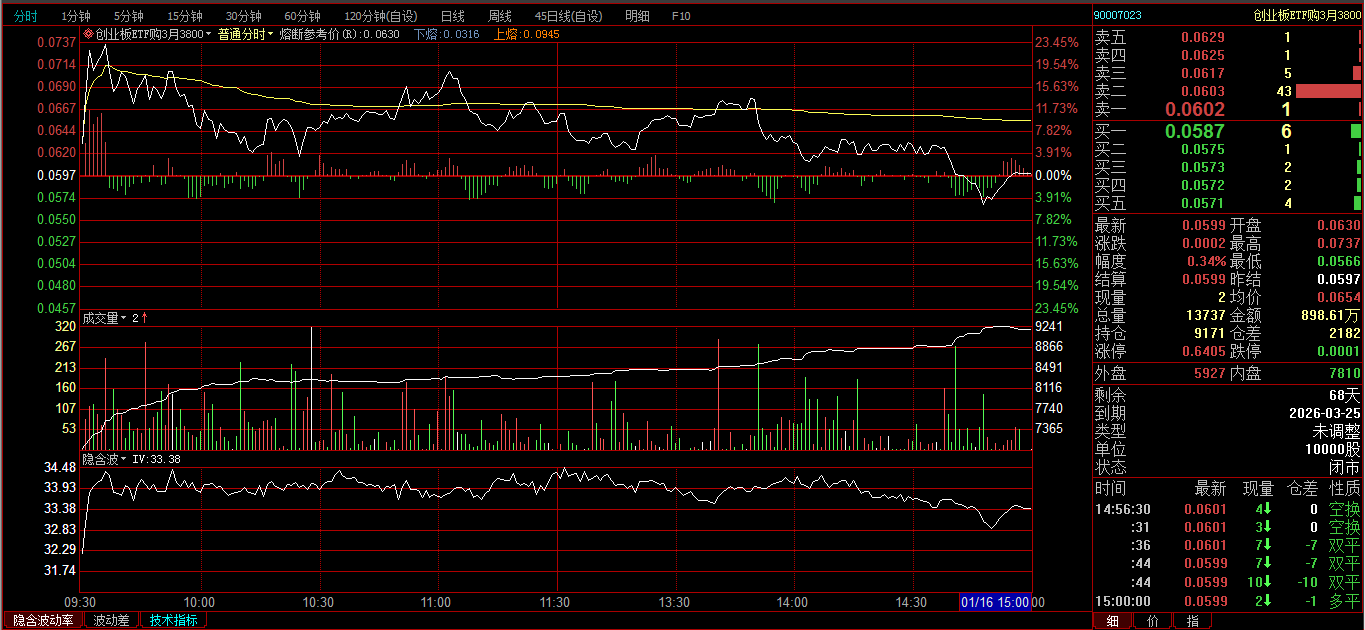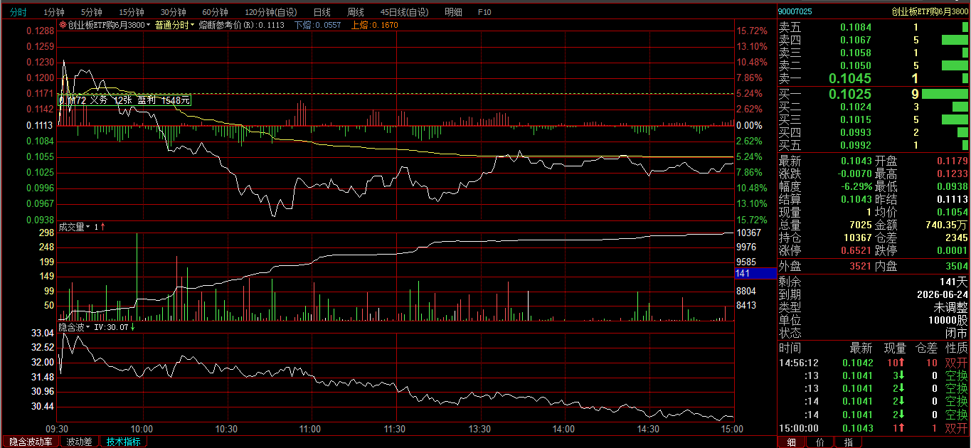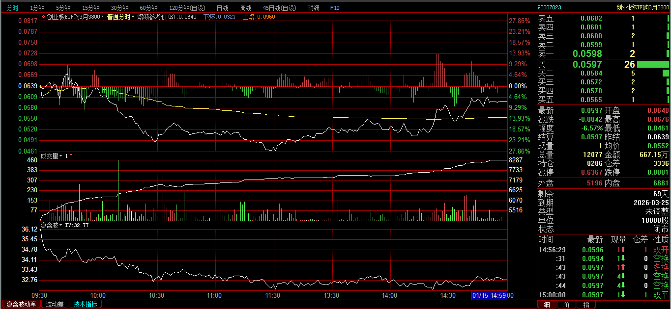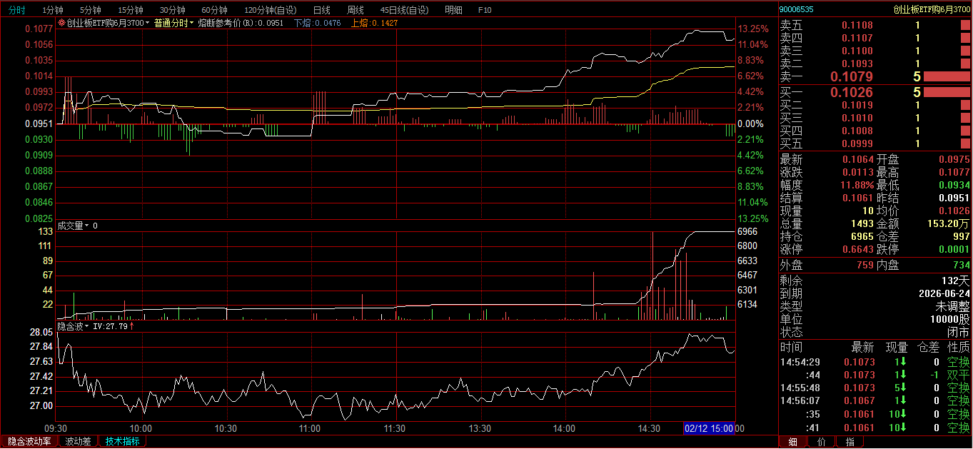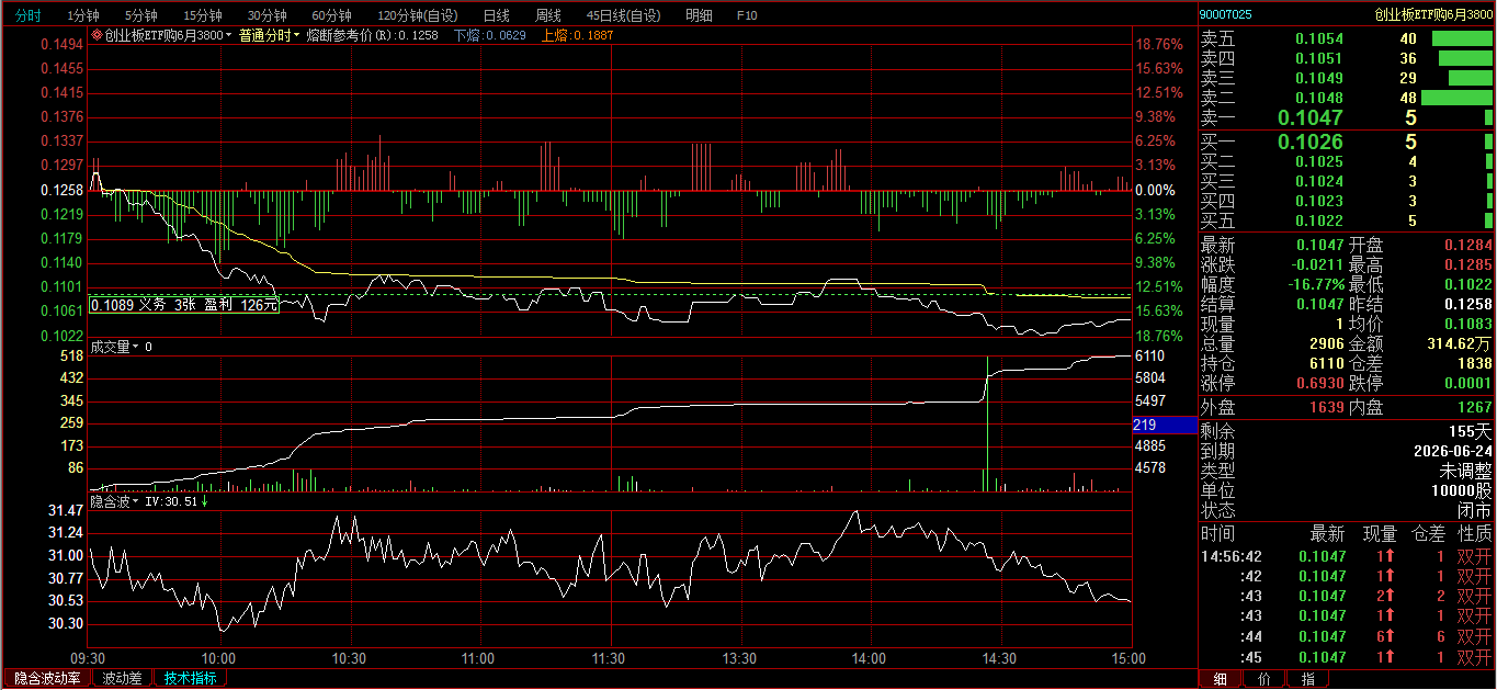 创业板ETF购2月3600卖开4张,成交价0.0239、0.0256、0.0297、0321;创业板ETF购3月3700卖开2张,成交价0.0385、0.0437。
