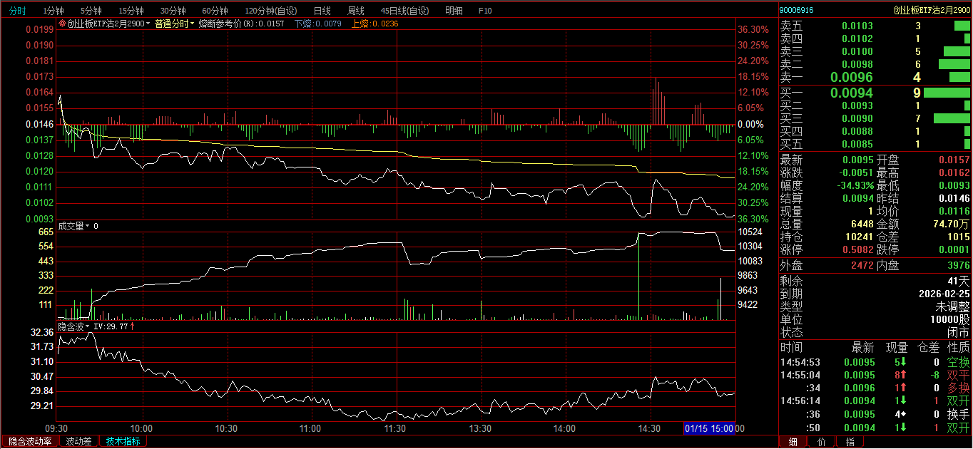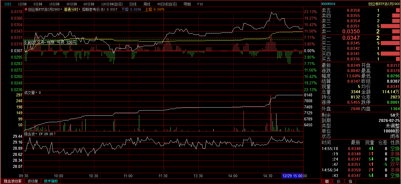 创业板ETF沽2月2900卖开1张,成交价0.0149。
