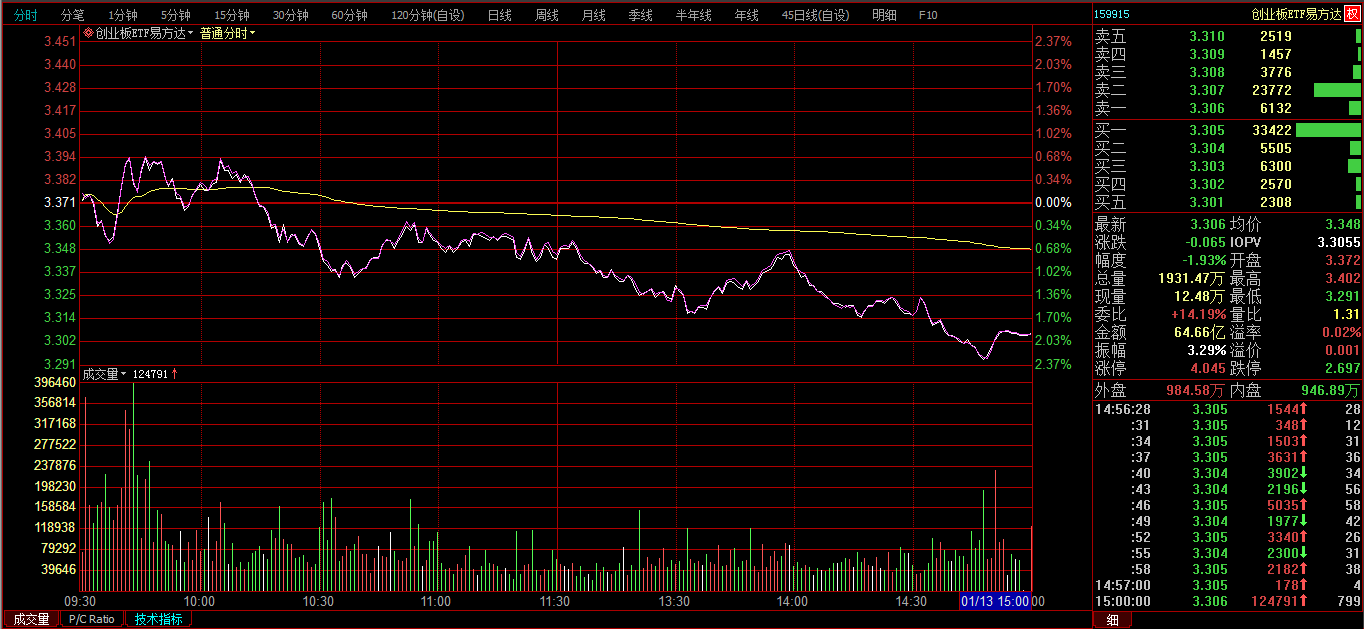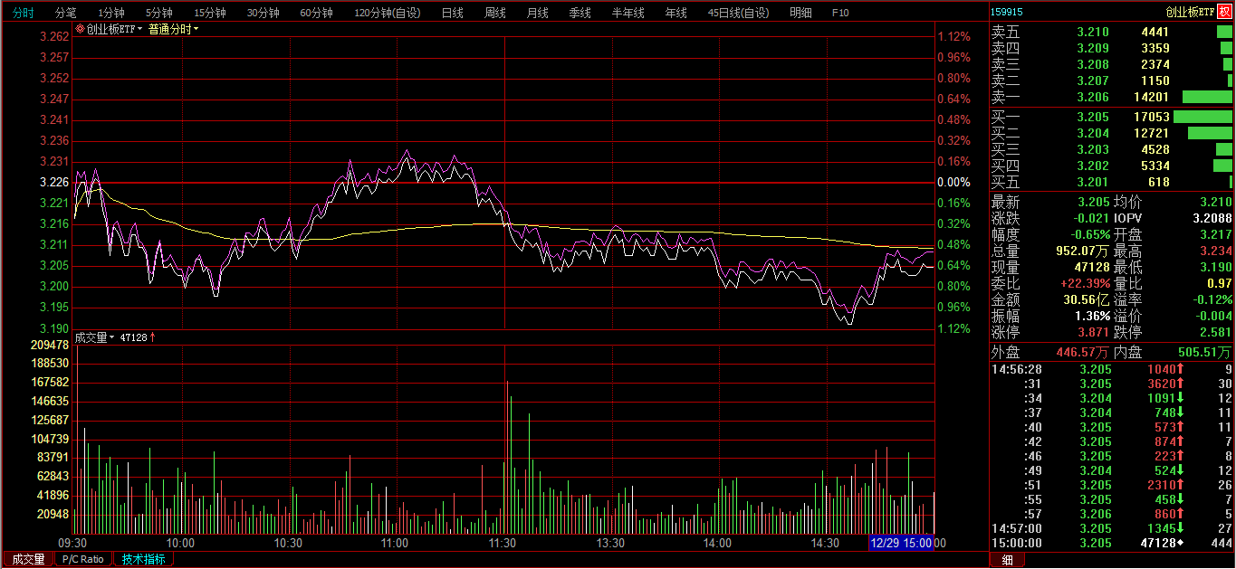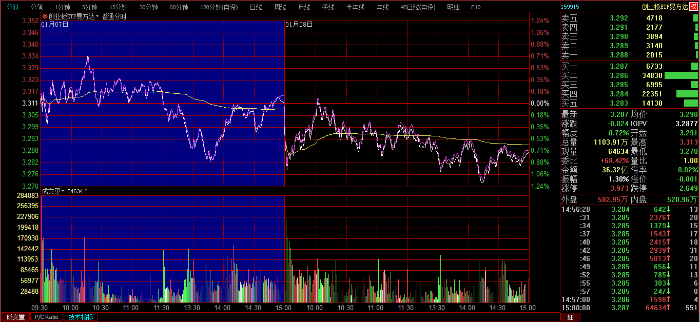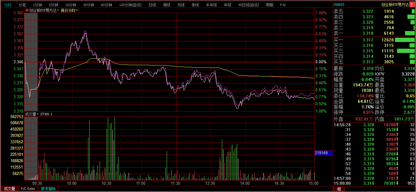 近三日,创业板ETF都是跌时放量,收市外盘量小于内盘量。