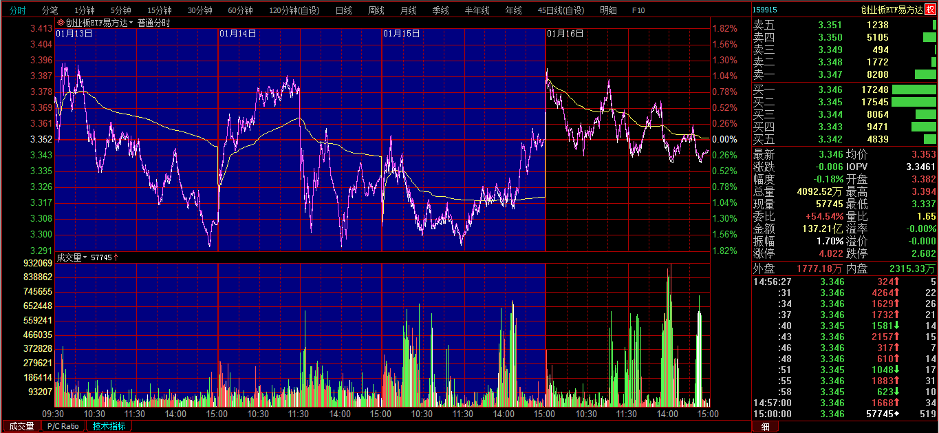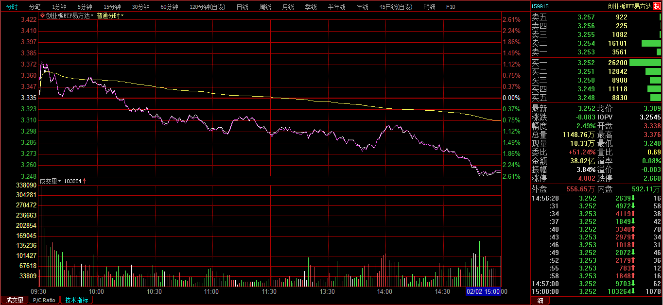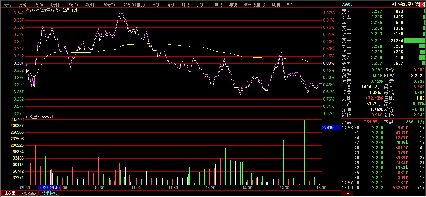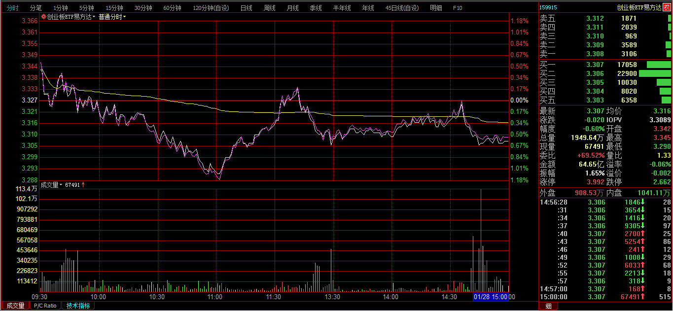 近三日,创业板ETF都是跌时放量,收市外盘量小于内盘量。