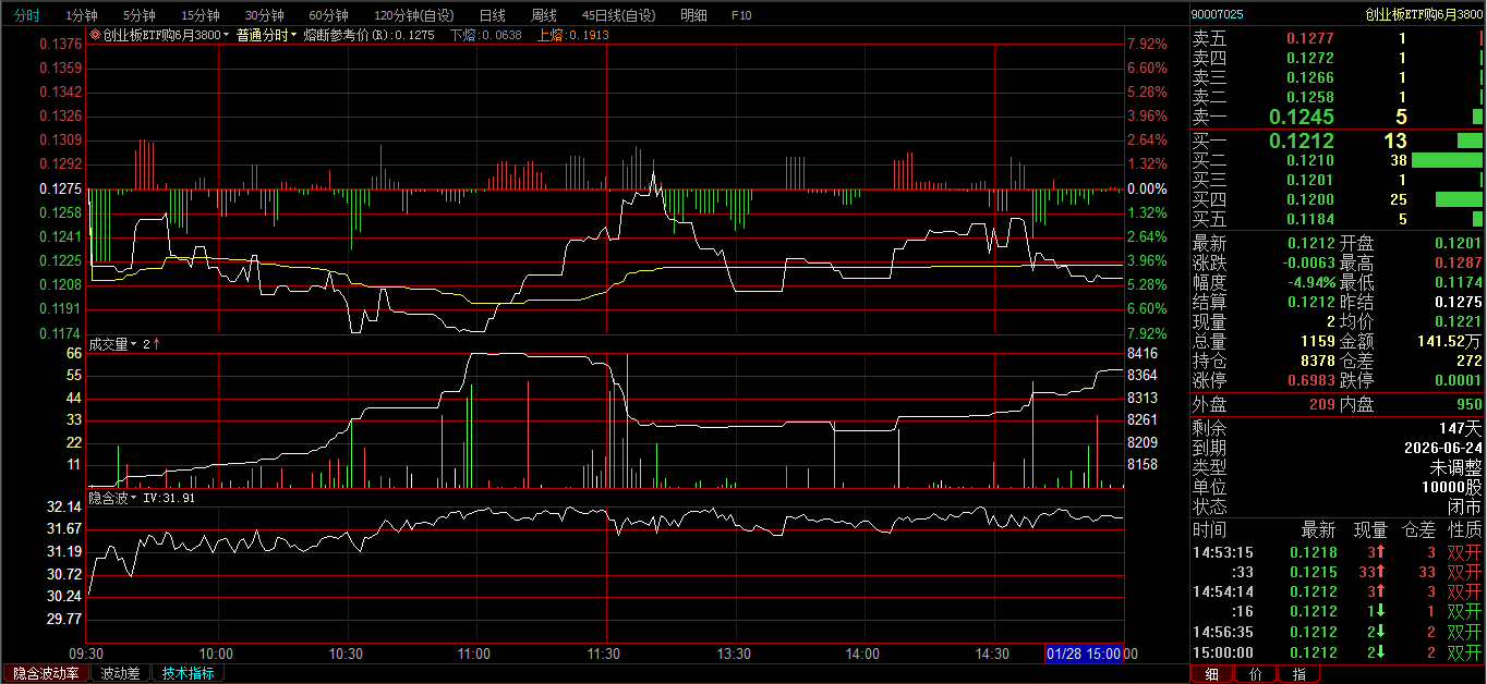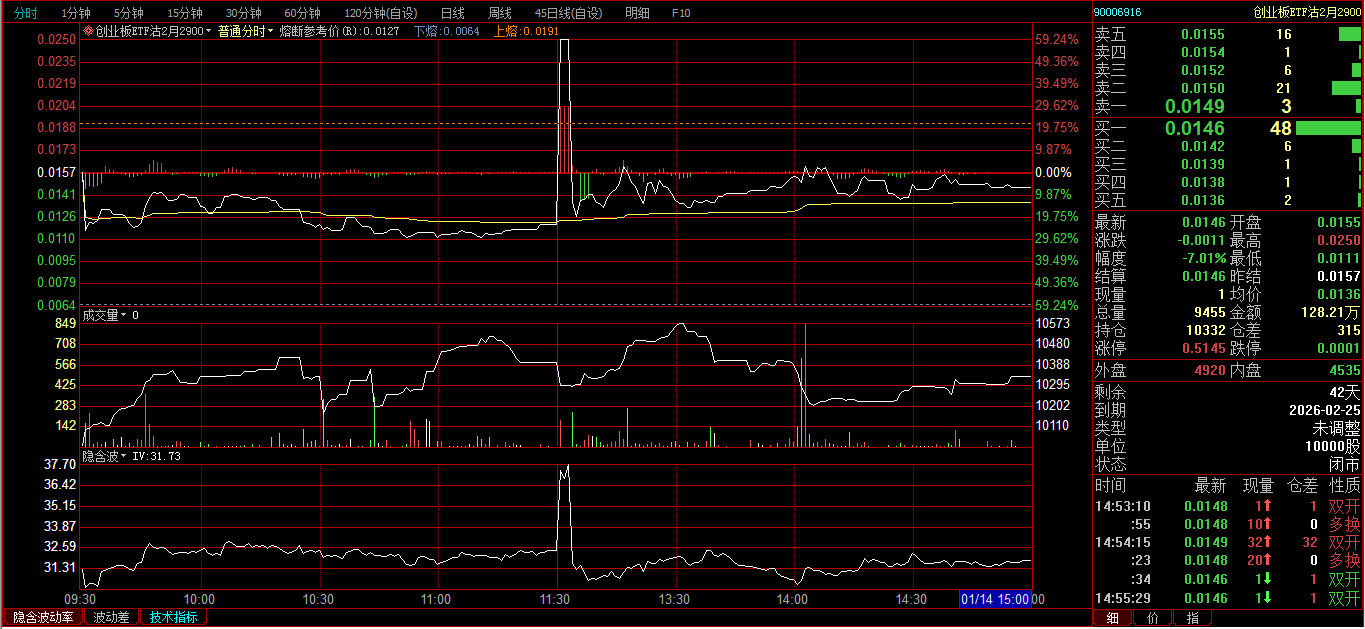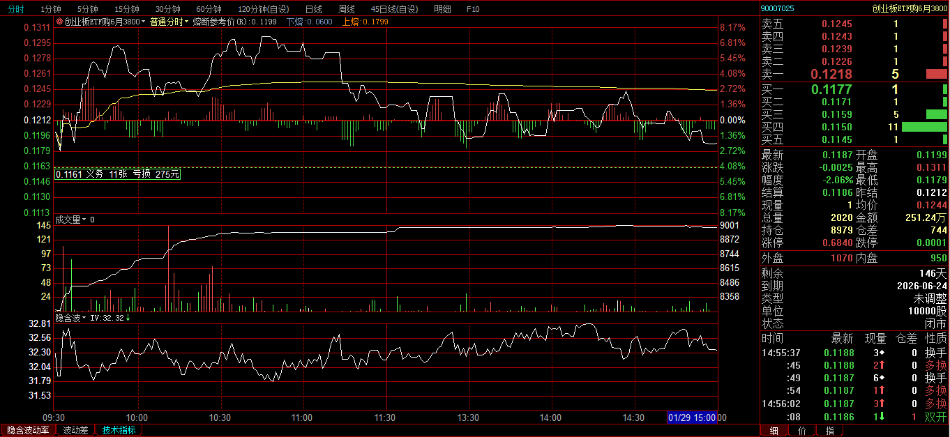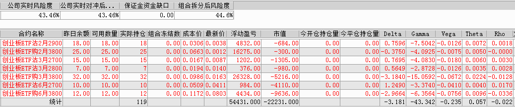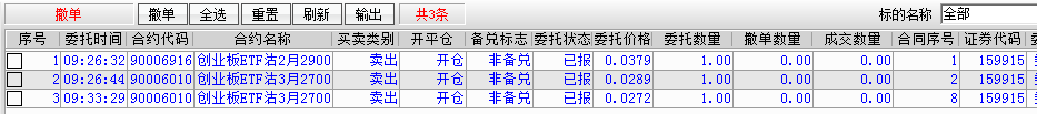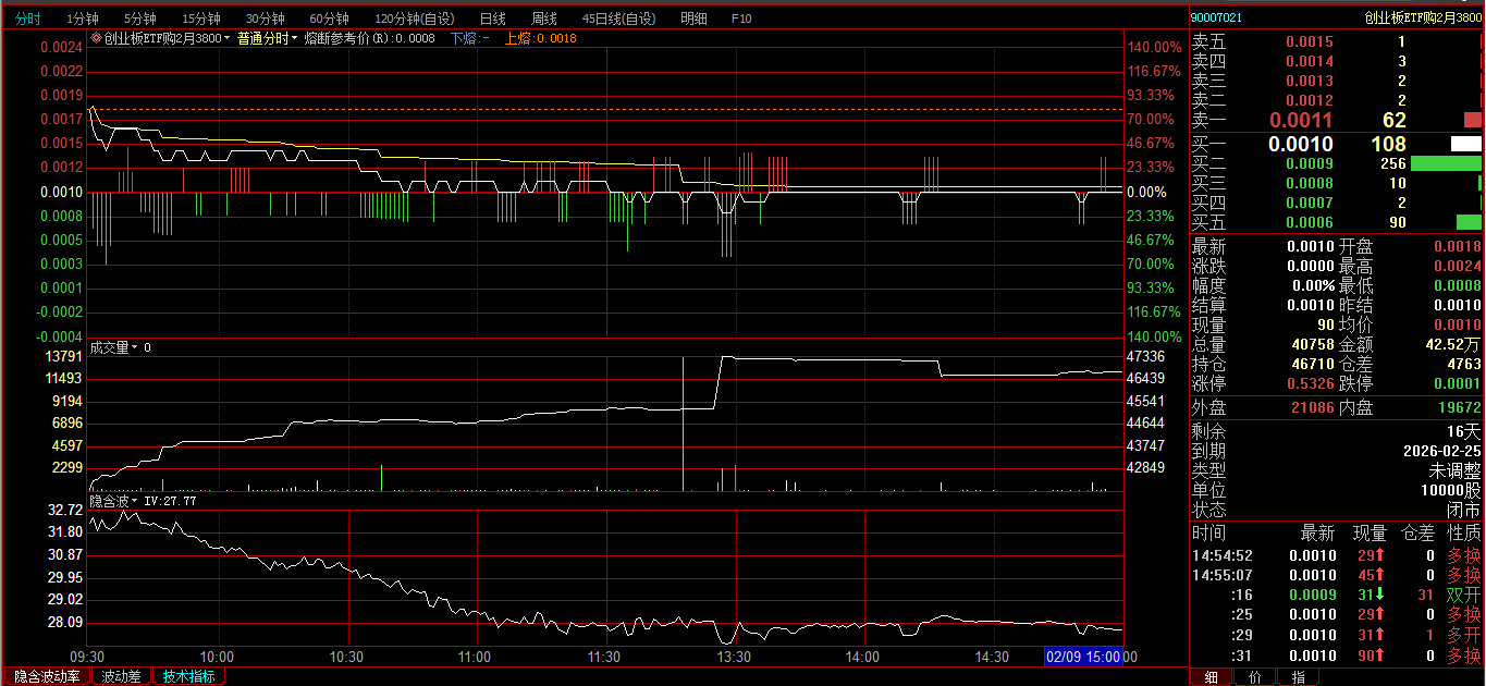标的一跌,我的持仓Delte值有所改善,当然,也可以卖开。创业板ETF沽2月2900卖开2张,0.0333、0.0339、0.0359;创业板ETF沽3月2700卖开1张,成交价0.0268。