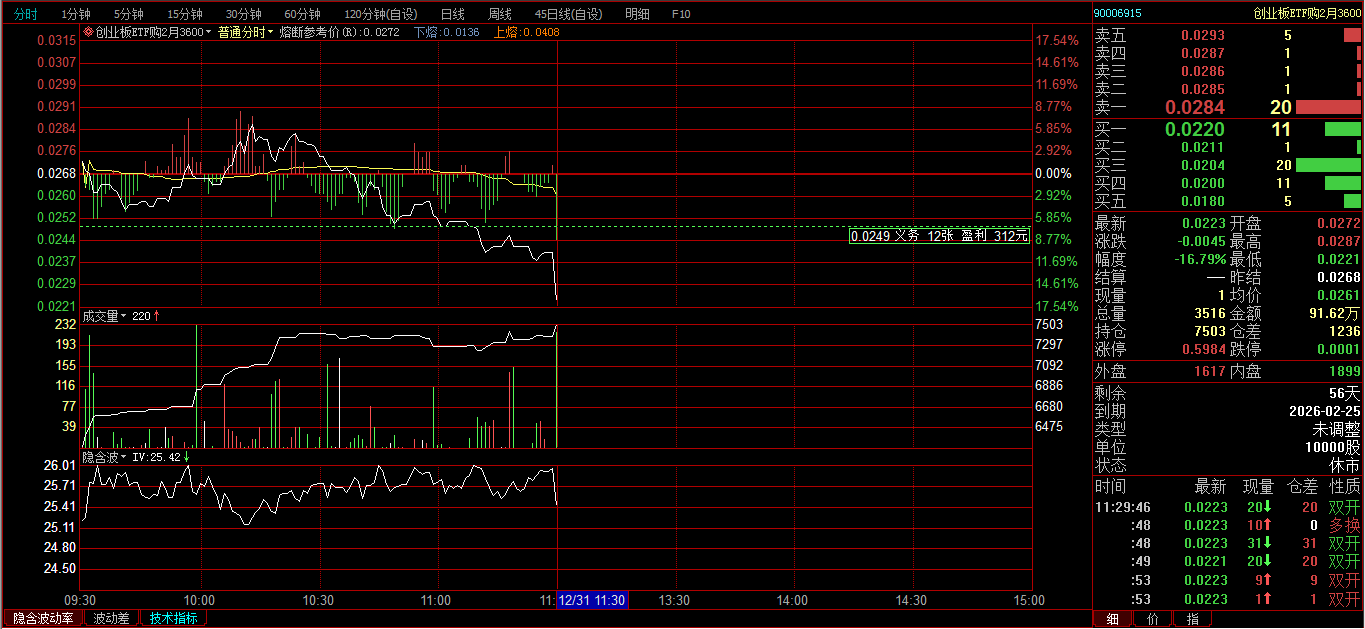上午收市,创业板ETF购2月3600合约上挂的买卖单也撤了不少,只见买一挂11张0.0220,卖一挂20张0.0284。这20张0.00284总觉得是做市商挂的。我即时下单0.0283卖开拦截,没成功: