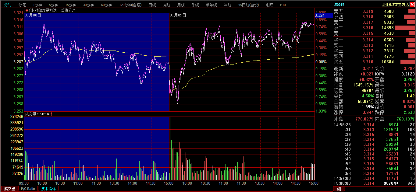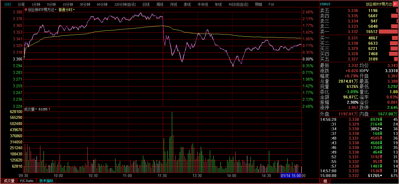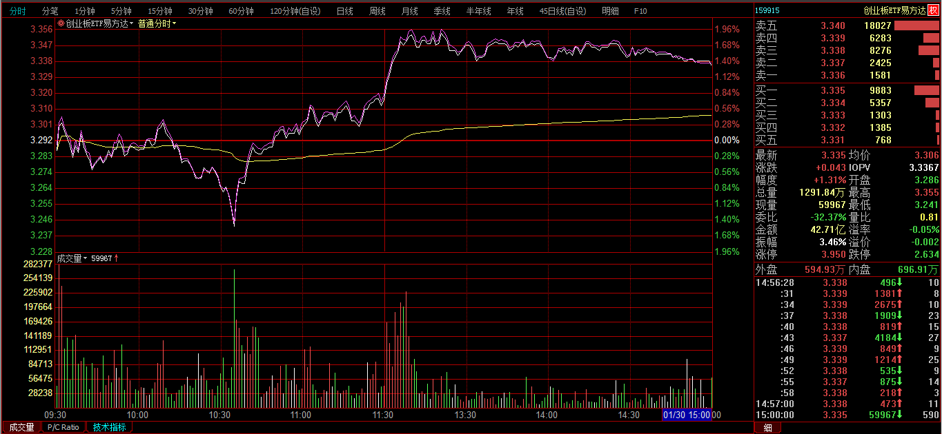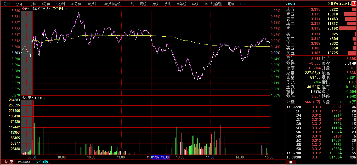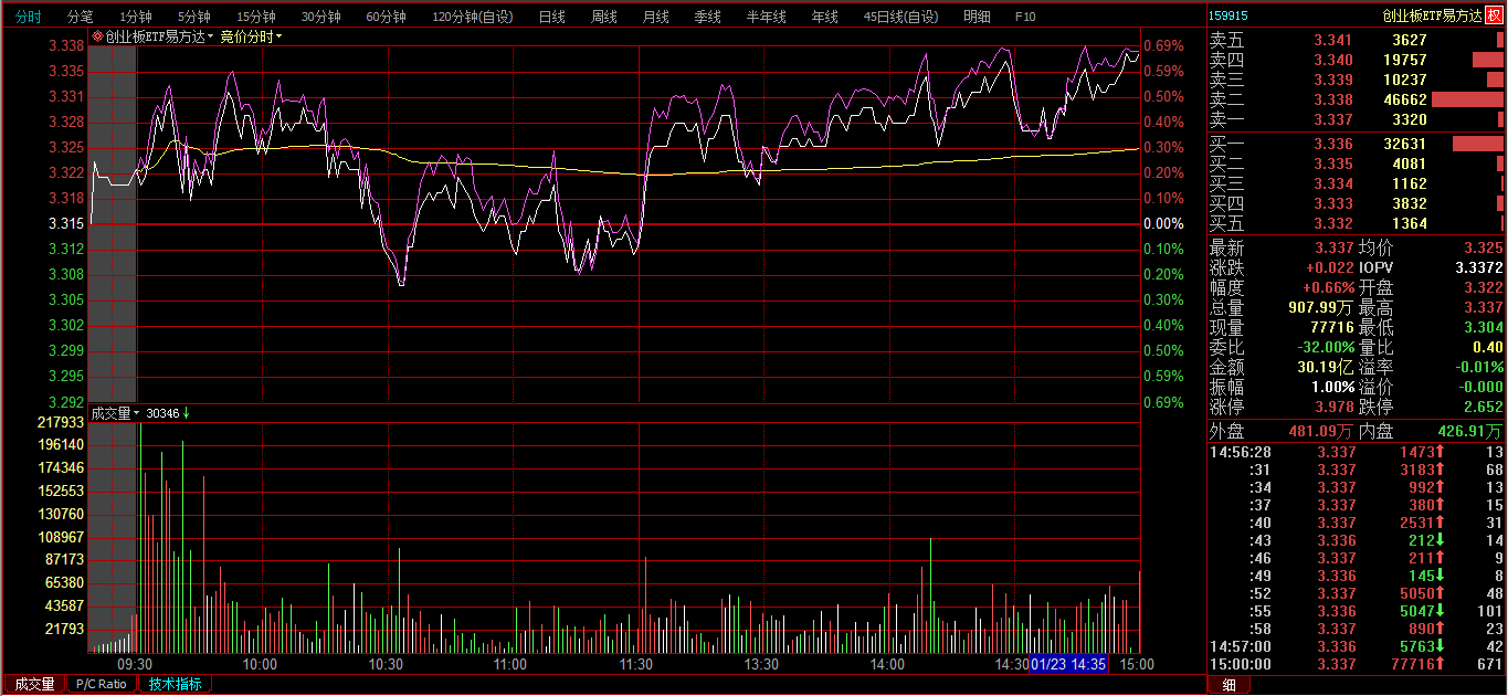 创业板ETF创出近几年来的新高3.336,仅次于2021年7月22日创下的3.463。创业板ETF分时图: