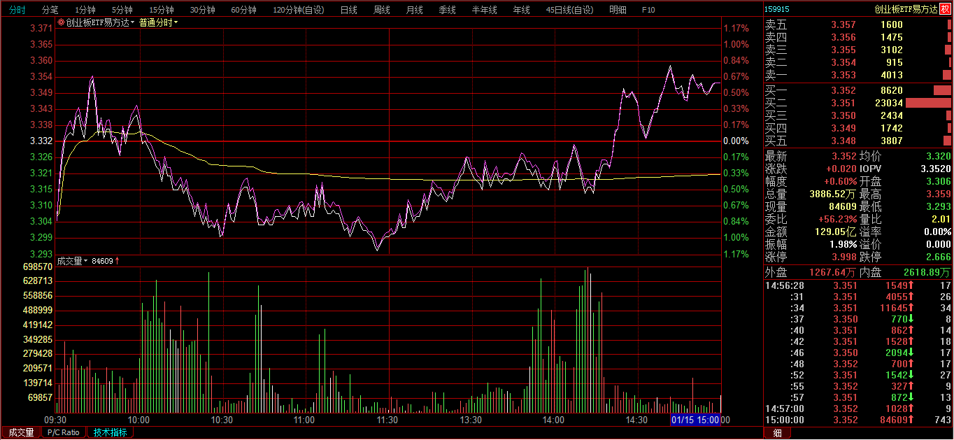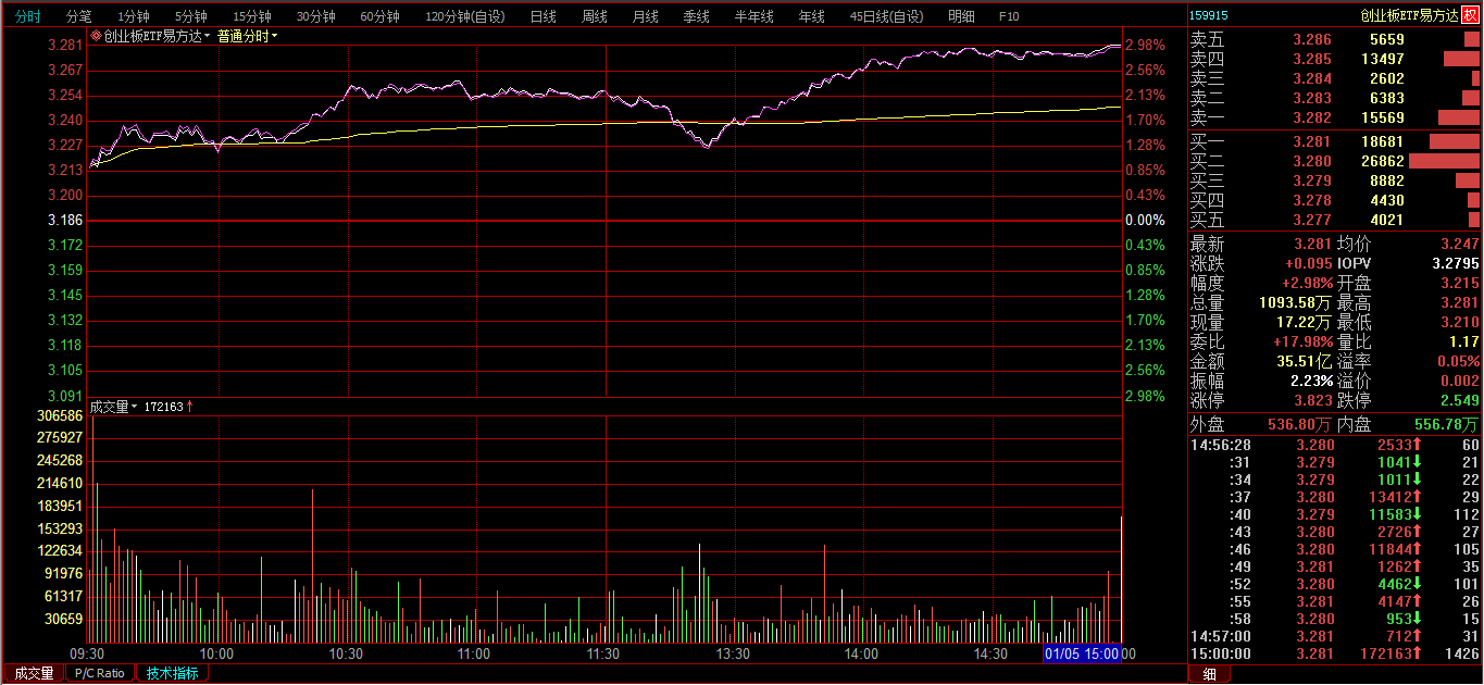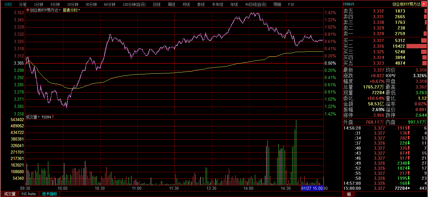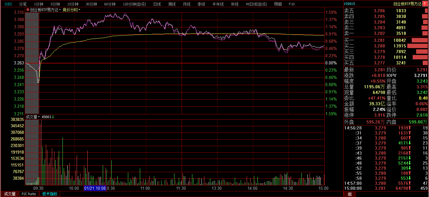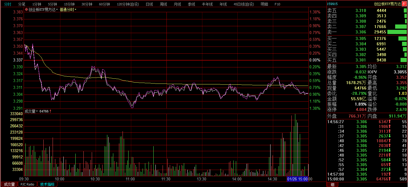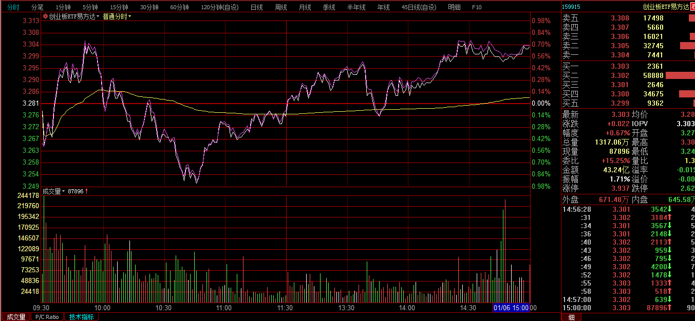 创业板ETF创出近几年来的新高3.336,仅次于2021年7月22日创下的3.463。创业板ETF分时图: