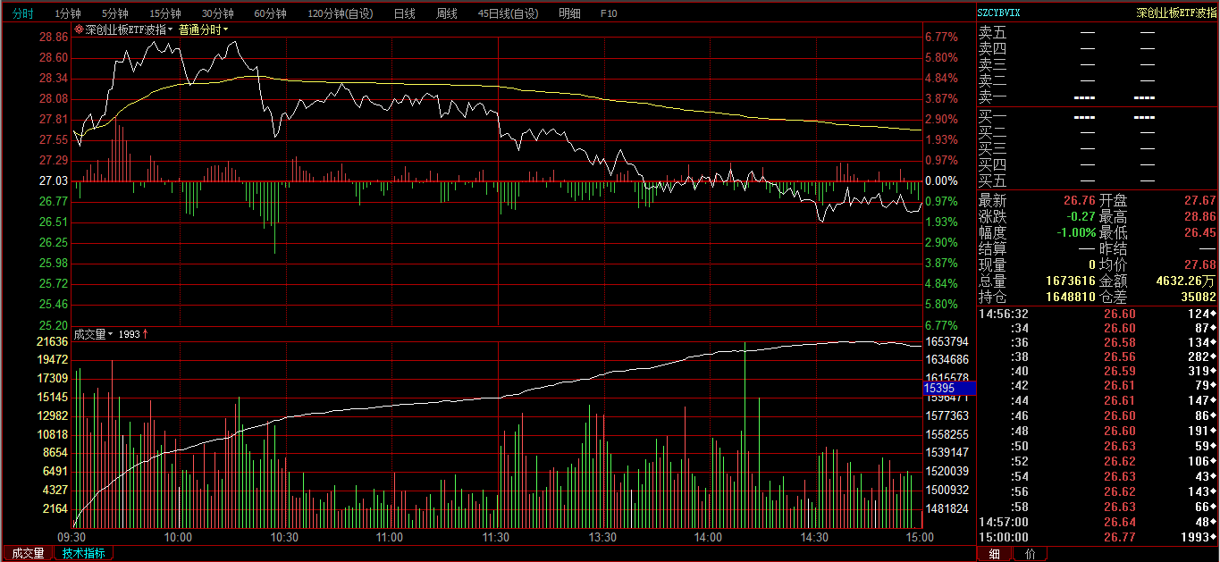 创业板ETF期权合约绿多红少,除了6月合约。创业板ETF波指分时图: