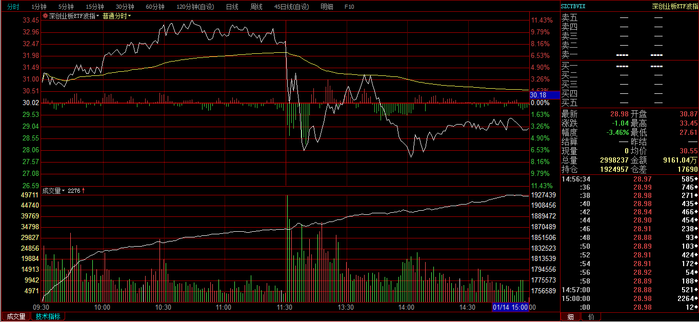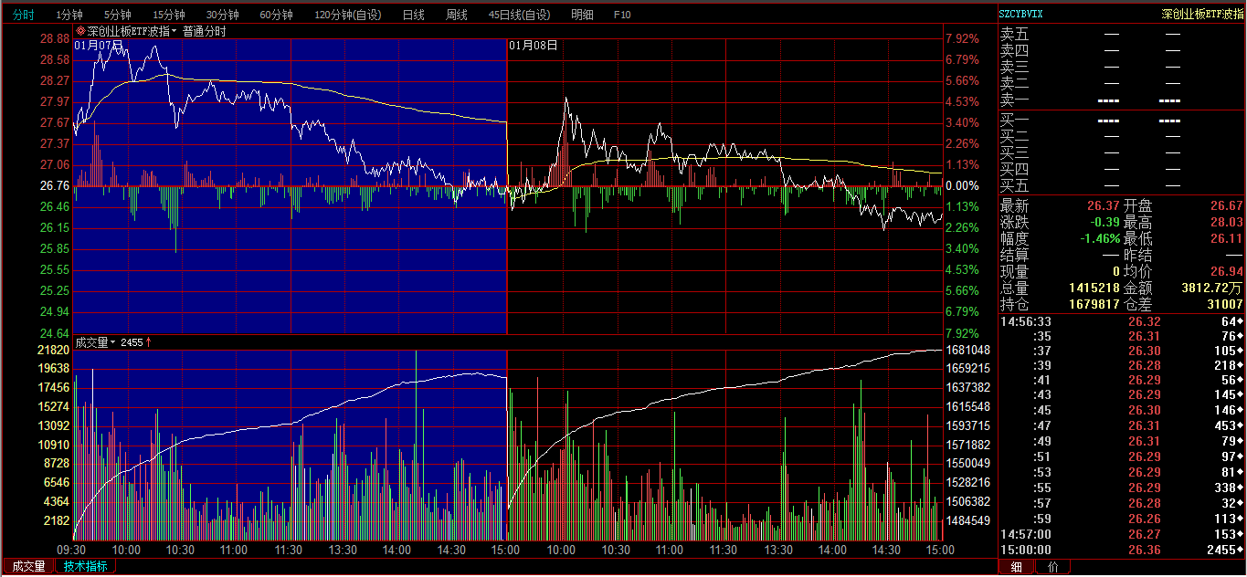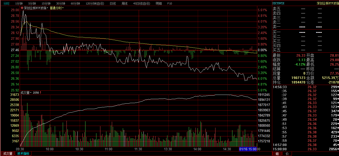 大部分波指都是高开低走,人心思开门红吧。创业板ETF波指分时图: