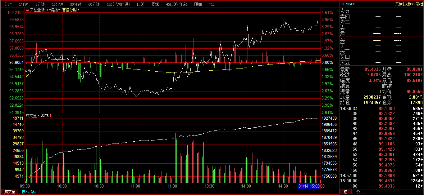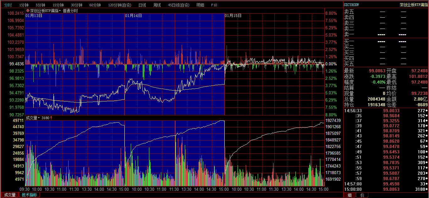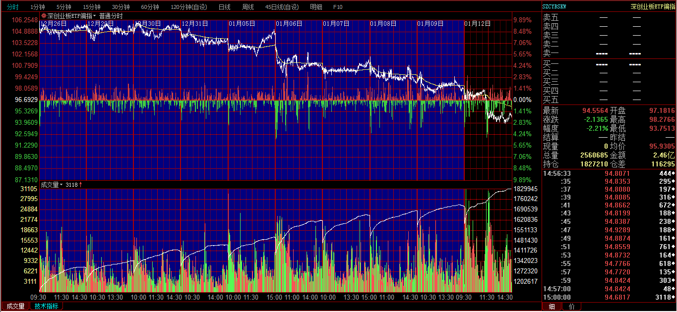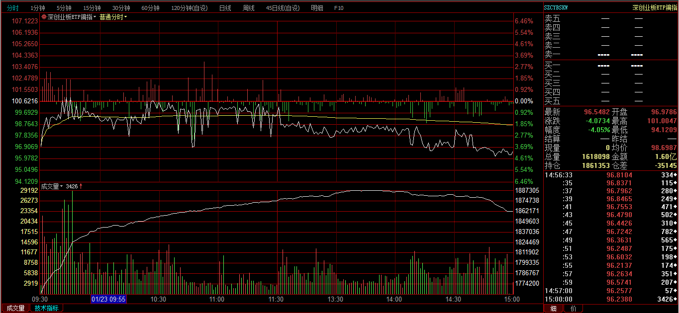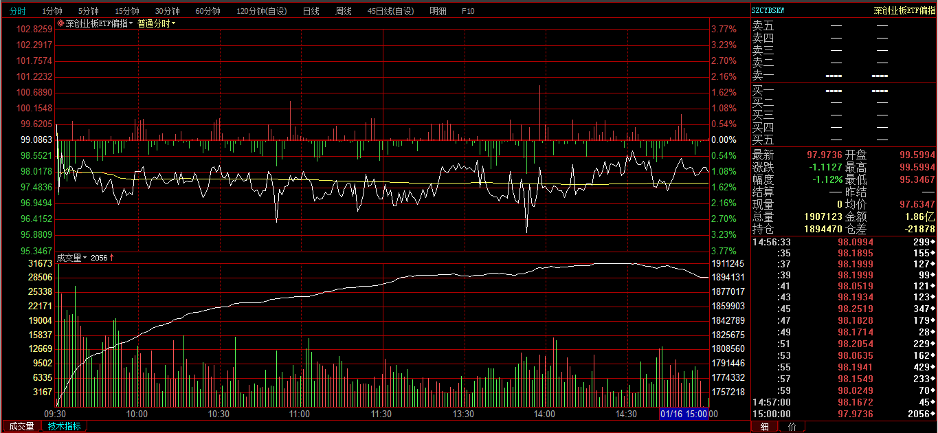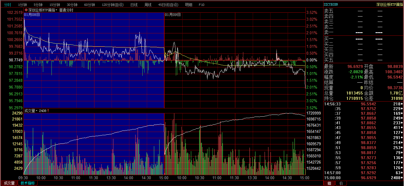 创业板ETF偏指咋日跌破100,今日继续下行。创业板ETF偏指分时图: