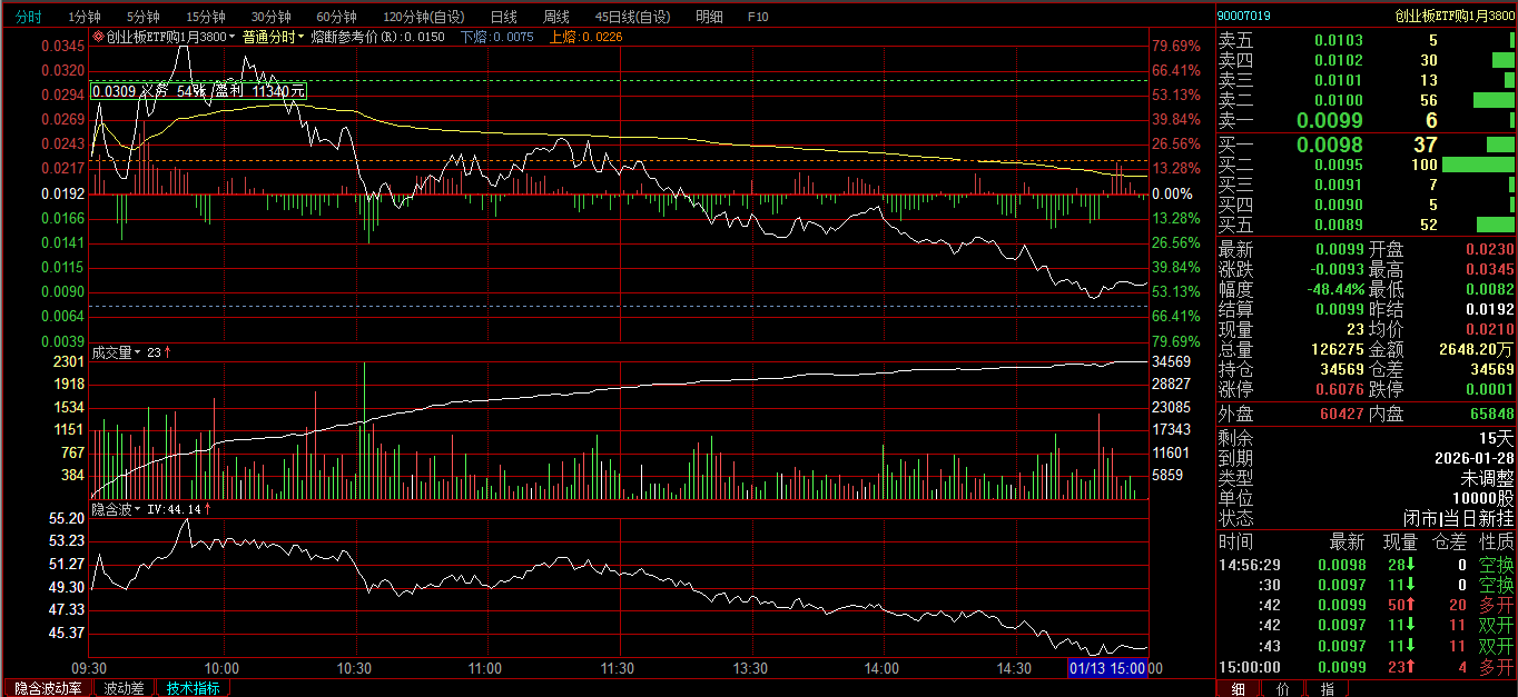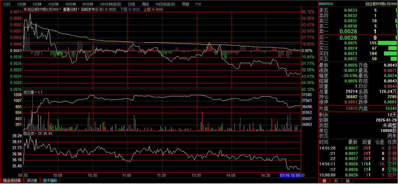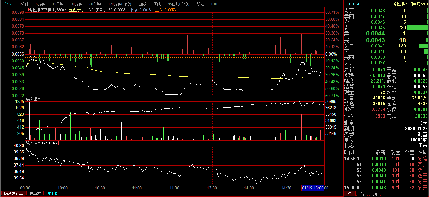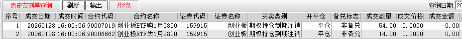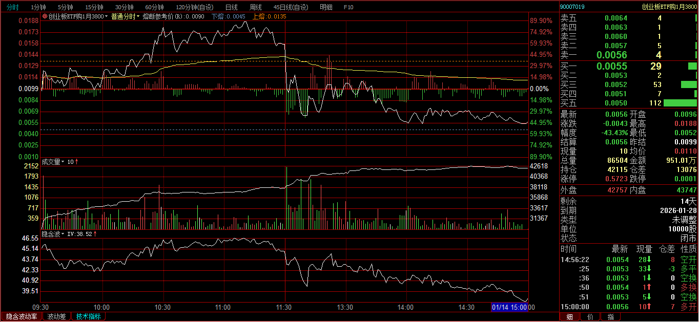 1月合约到期日。14张创业板ETF购1月2800、54张创业板ETF购1月3800到期,自然而然,释放一大笔保证金。